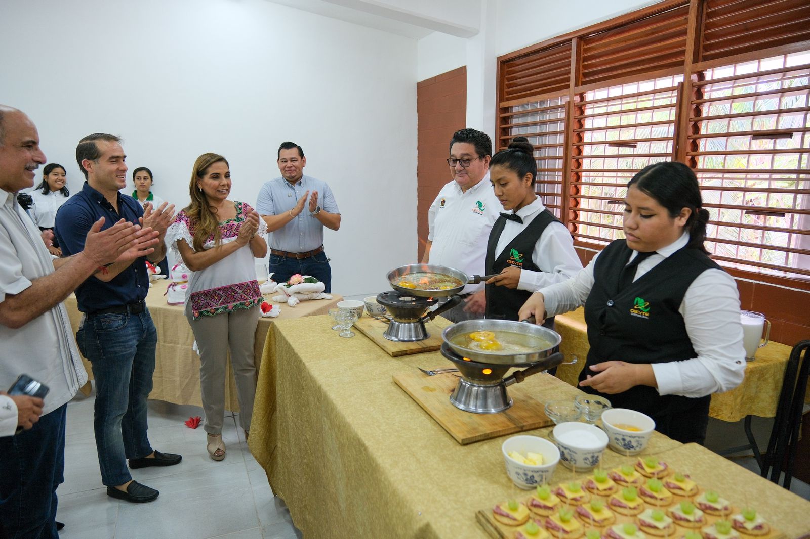 Acompañada de la alumna Damaris Estefanía Olan García, del presidente del comité de padres de familia Antonio Guichard Hernández, de la directora del plantel Silvia Isabel Mendoza García, la gobernadora Mara Lezama recorrió las instalaciones con las explicaciones del director del IFEQROO José Rafael Lara Díaz. Hubo una demostración por parte de alumnos de la carrera de alimentos.