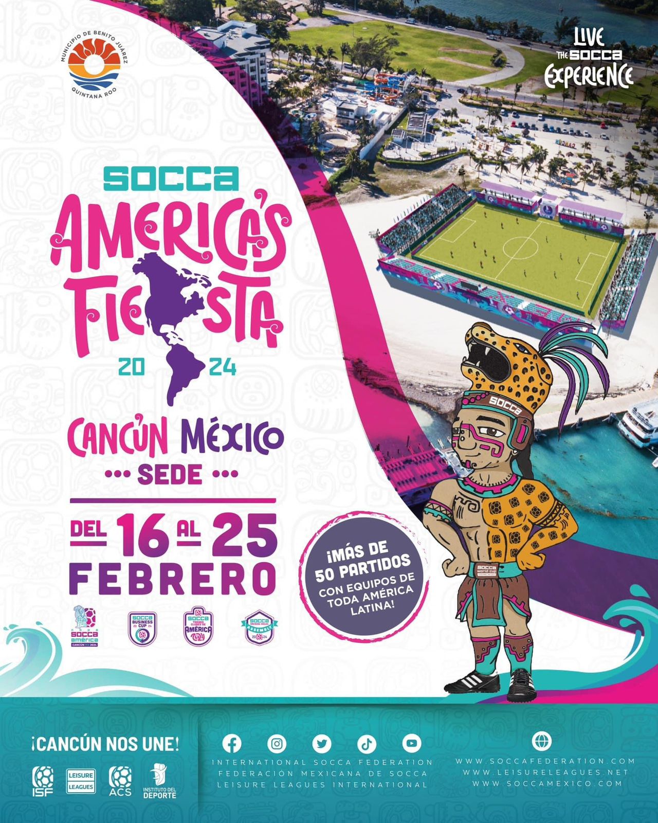 Luego de la gestión por parte del gobierno municipal, a través del Instituto del Deporte (IMD), durante la realización a inicios de junio de la Socca World Cup 2023 (Copa Mundial Socca 2023) celebrada en Essen, Alemania, la Primera Autoridad Municipal destacó que la justa deportiva más importante será la Copa Socca América Cancún MX 2024, que será del 22 al 25 de febrero, en Playa Langosta, con acceso gratuito para disfrute de cancunenses y visitantes.
