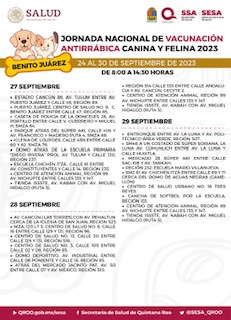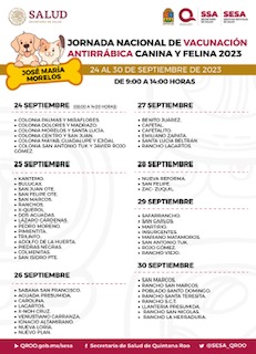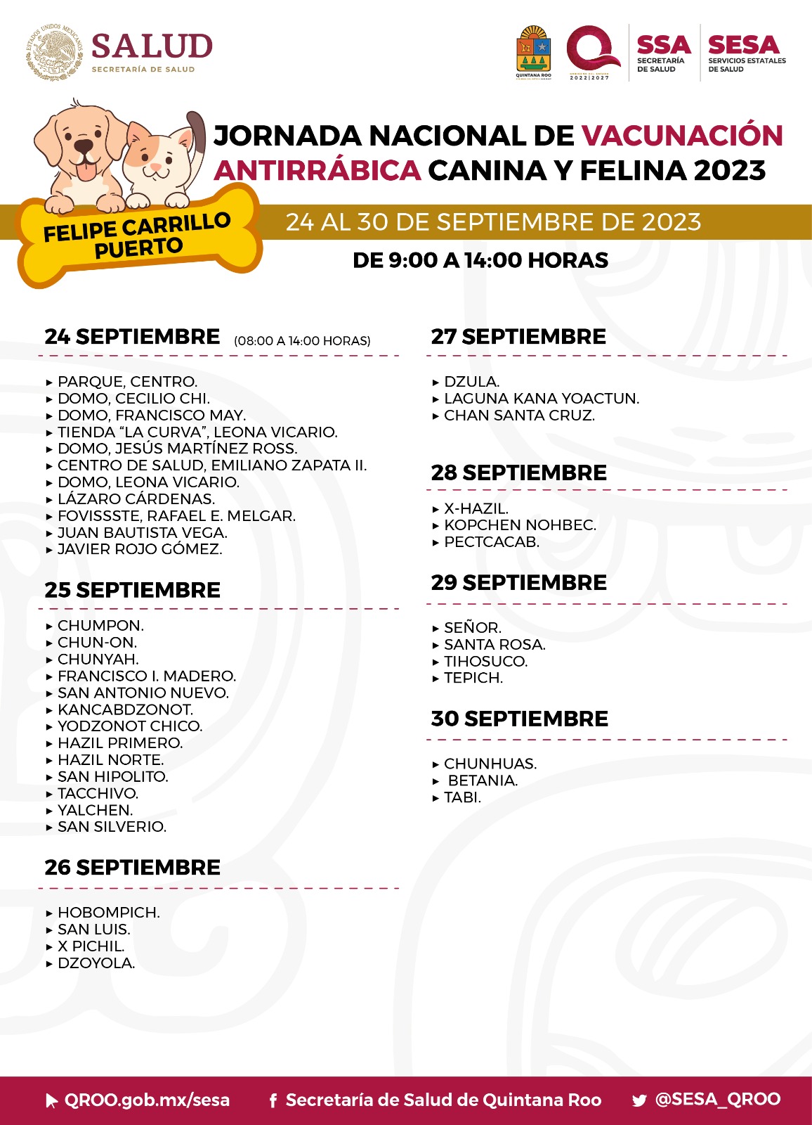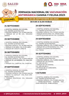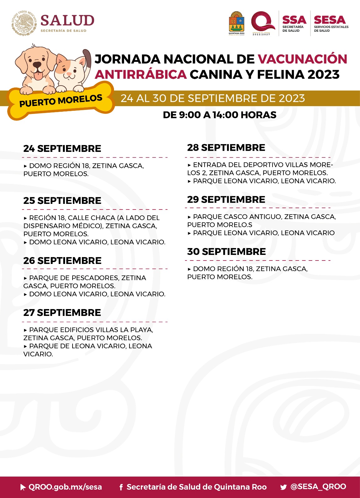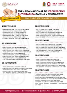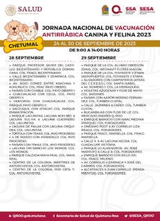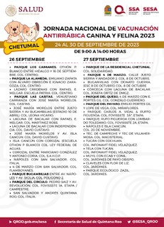 Al respecto, recomendó a la población consultar la siguiente página qroo.gob.mx/sesa/jornada-vacunacion-antirrabica para verificar la calendarización de los puestos de vacunación.