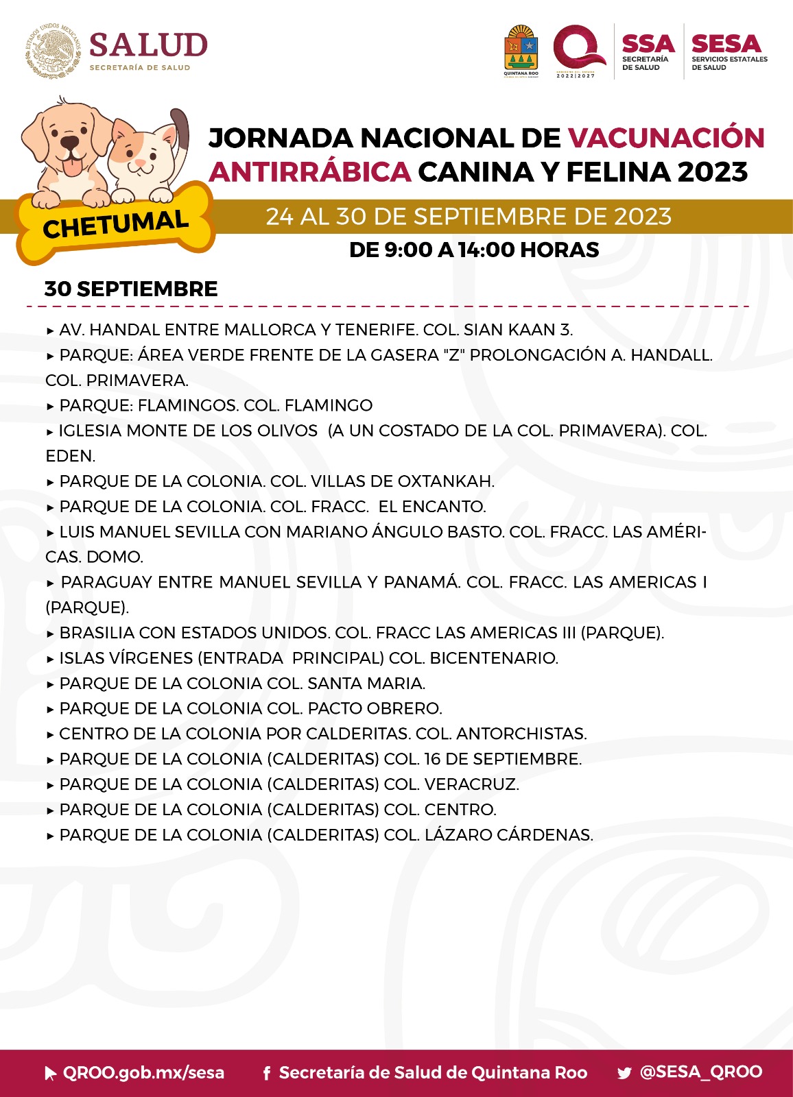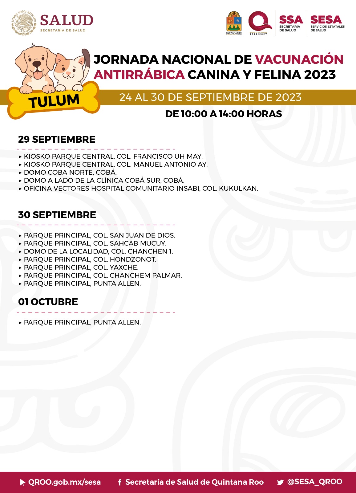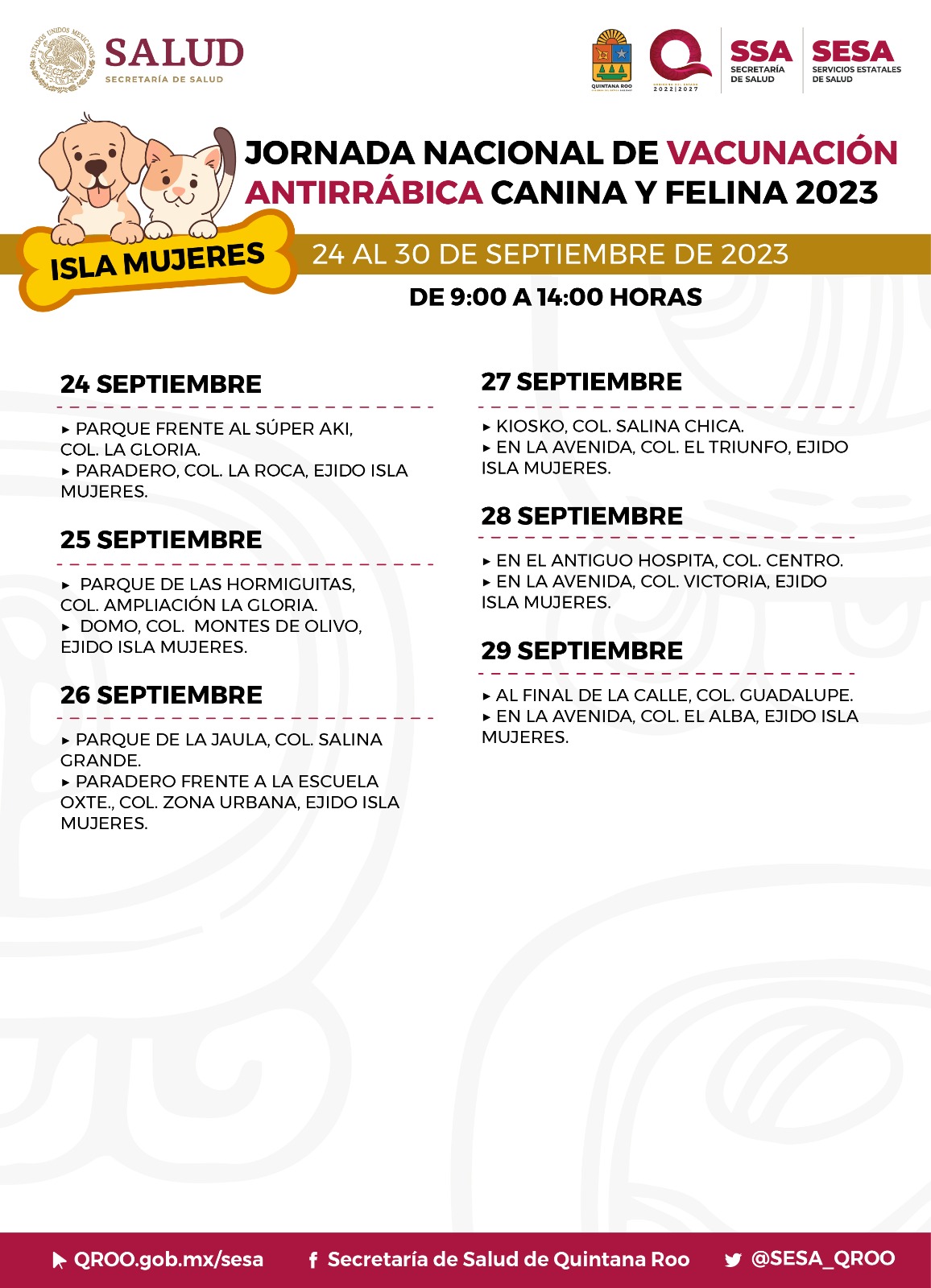 Al respecto, recomendó a la población consultar la siguiente página qroo.gob.mx/sesa/jornada-vacunacion-antirrabica para verificar la calendarización de los puestos de vacunación.