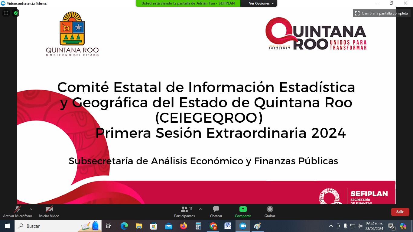 Chetumal.- Con el objetivo de aprobar el Programa Estatal de Estadística y Geografía que contiene los ejes rectores en materia de generación de información de 2024 a 2027, la Secretaría de Finanzas y Planeación (SEFIPLAN) presidió la Primera Sesión Extraordinaria 2024 del Comité Estatal de Información Estadística y Geográfica del Estado de Quintana Roo (CEIEGEQROO), integrado por 18 instituciones de la administración pública estatal.