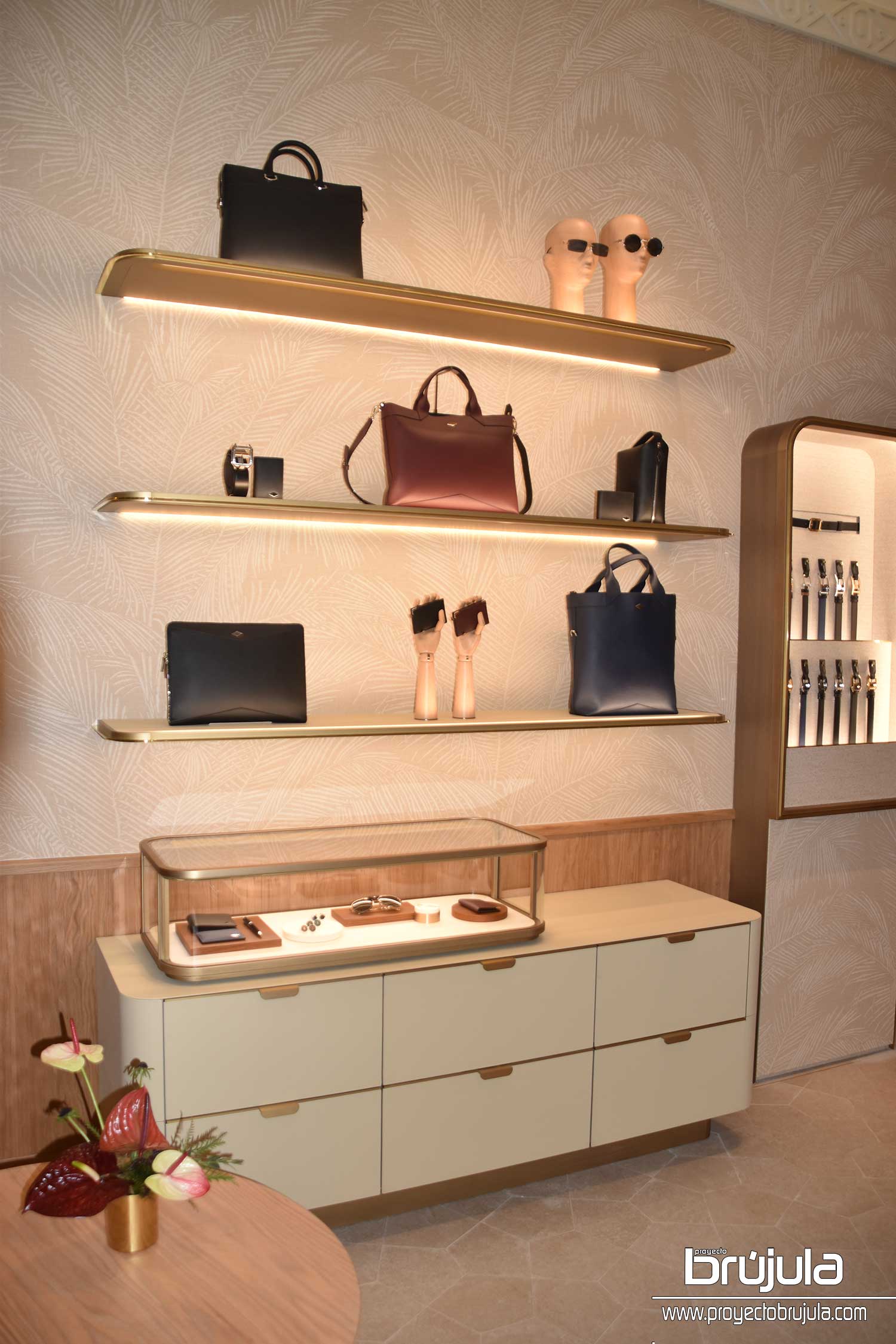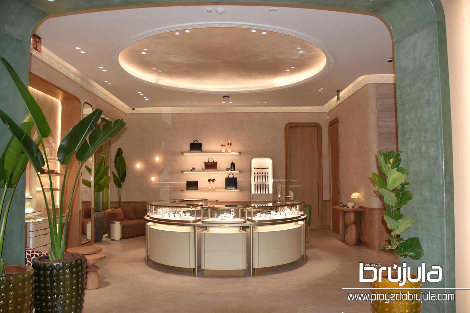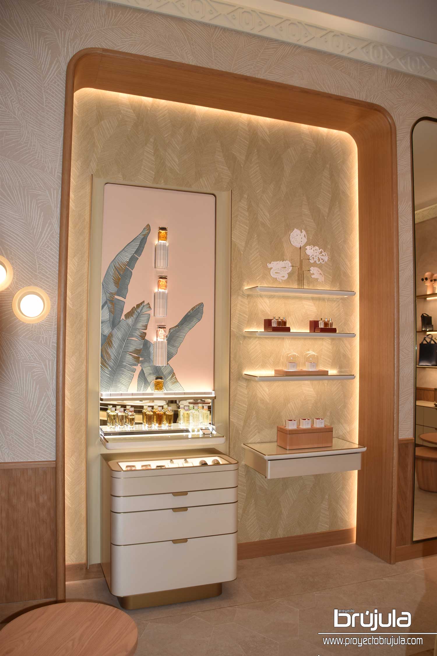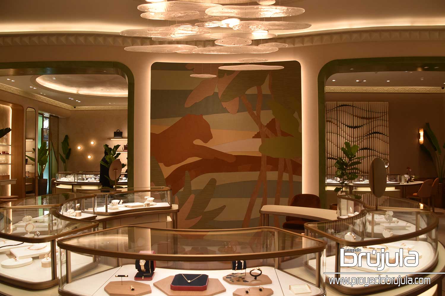 Durante el recorrido por las instalaciones disfrutamos de una selección curada que se manifiesta mediante una combinación de texturas y matices, y una paleta de tonos cálidos y luminosos inspirados en la identidad natural de Cancún que son plasmados en elementos fundamentales del diseño. La fachada rinde homenaje al Sascab, la piedra típica y simbólica de la región. La pátina soleada que reviste el techo del espacio de joyería creativa revive el dorado resplandeciente del oro Cartier; y los arcos de color verde que conectan cada área interior tienen como inspiración la piel de cocodrilo, un animal endémico de la región. Como remate visual entre muchas texturas, se encuentra al fondo una pantera en forma abstracta que reposa cerca de un cenote al tiempo que admira la silueta de una pirámide: Chichen Itzá. De tal modo, cada elemento pone en diálogo dos mundos, mismos que al entrelazarse revelan el inmejorable savoir-faire de la Maison,