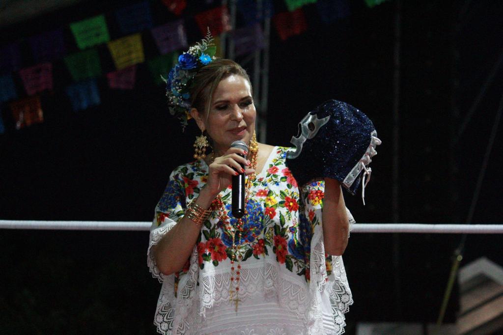 PLAYA DEL CARMEN, Q. ROO a 8 de julio.- Teniendo en primera fila a la alcaldesa Lili Campos Miranda, acompañada por miles de solidarenses, la tarde de este viernes se pusieron en marcha con una magna función de Lucha Libre, las actividades de la “Feria de Playa del Carmen 2023”, siendo el padrino de lujo, la leyenda del pancracio nacional Blue Demon Jr., quien junto al internacional Mr. Águila y una baraja muy completa de exponentes peninsulares del llamado deporte espectáculo, deleitaron a los asistentes con sus mejores llaves y cualidades sobre el cuadrilátero.