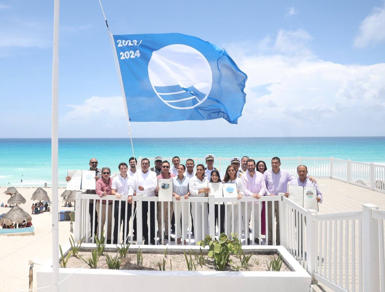 En un marco festivo, la Presidenta Municipal y la Gobernadora, acompañadas por la presidenta honoraria del DIF Quintana Roo, Verónica Lezama Espinosa, recibieron el certificado correspondiente en papel y la bandera color azul que posteriormente izaron en el asta bandera de Playa Delfines, tal como lucirán en el resto de los arenales públicos de Cancún ganadores, así como las de los hoteles y las embarcaciones de turismo sostenible.
