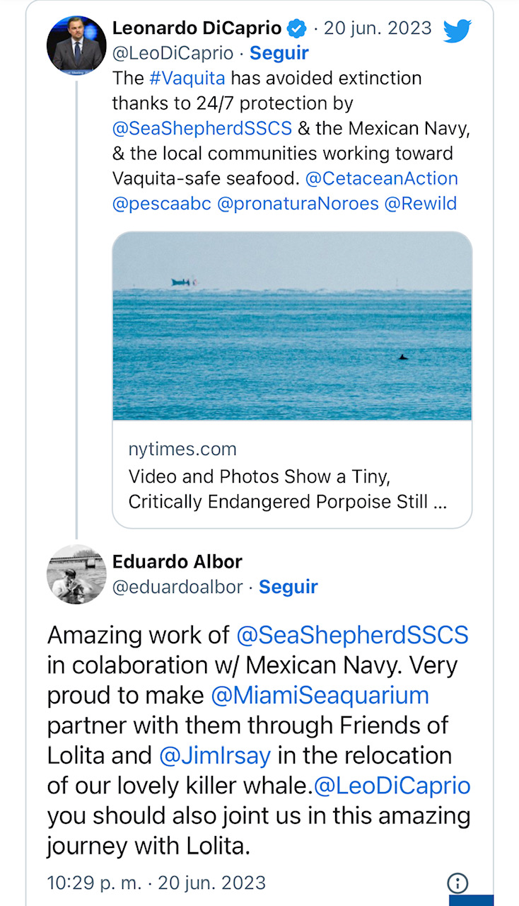 “Impresionante trabajo de @SeaShepherdSSCS en colaboración con la Armada de México. Muy orgulloso de hacer que @MiamiSeaquarium se asocie con ellos a través de Friends of Lolita y @JimIrsay en la reubicación de nuestra adorable orca. @LeoDiCaprio también deberías unirte a nosotros en este increíble viaje con Lolita”.