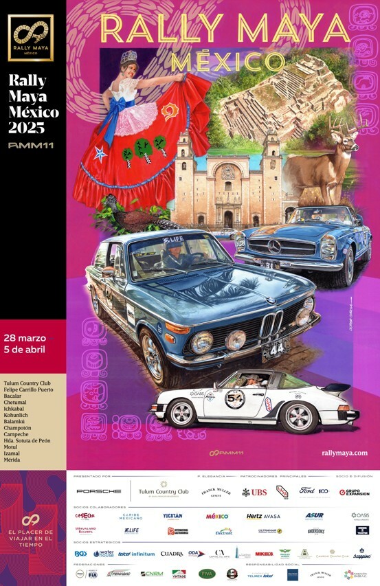 El póster de este año, fiel al estilo de García, no solo resalta la pasión por los autos clásicos, sino que también encapsula la riqueza cultural, histórica y natural de la Península de Yucatán. Cada edición del Rally Maya México presenta una paleta de colores y símbolos distintos, en función del recorrido y su conexión con el legado de la región.
