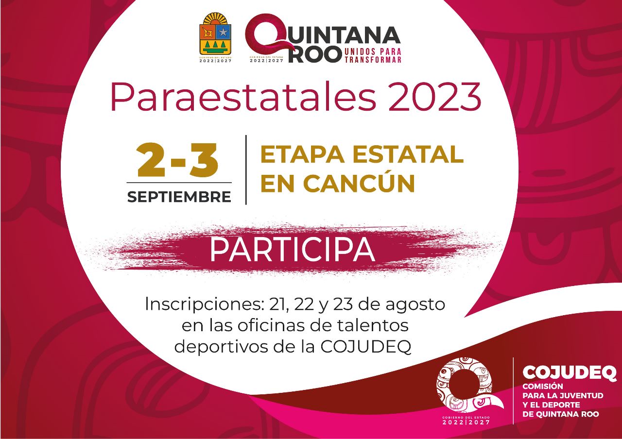 Las inscripciones para competir en la fase Paraestatal de la justa, será del 21 al 23 de agosto próximos, en las oficinas de Talentos Deportivos de la COJUDEQ en Chetumal, cumpliendo con los requisitos que solicita la convocatoria, la cual se puede descargar vía internet a través del link: qroo.gob.mx/cojudeq/wp-content/cojudeq/uploads/2023/08/convocatoria-paranacionales.pdf