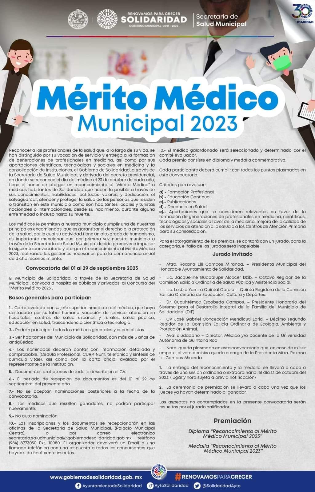 Playa del Carmen, Solidaridad, 2 de septiembre del 2023.- Por primera vez, el municipio de Solidaridad convoca a hospitales privados o públicos a inscribir a su personal médico al concurso “Mérito al Médico 2023”, a través del cual el gobierno que encabeza Lili Campos reconocerá la labor, compromiso y aportación a la protección de la salud de las y los solidarenses y turistas.