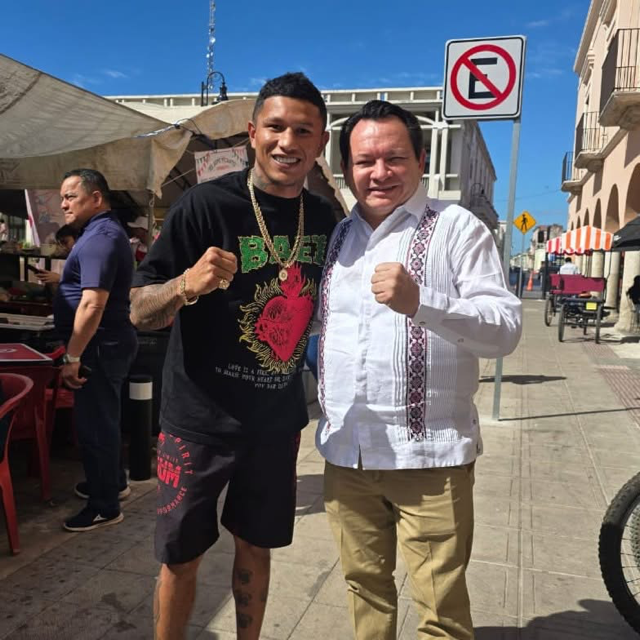 “Un gusto saludar al Alacrán Berchelt esta mañana en Mérida en domingo en mi caminata rumbo a Palacio de Gobierno.” Dijo Huacho Diaz.