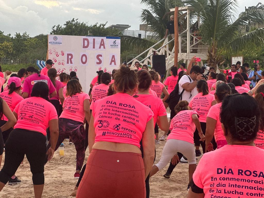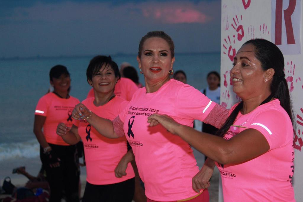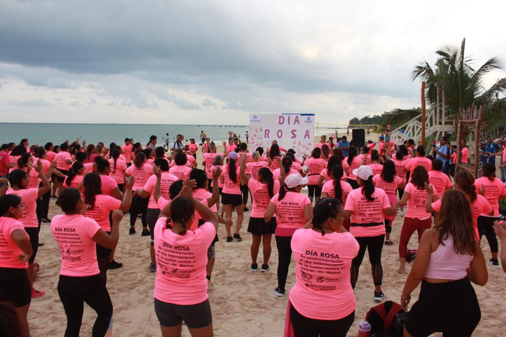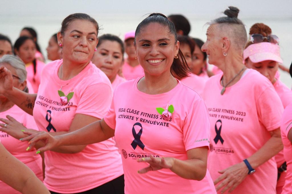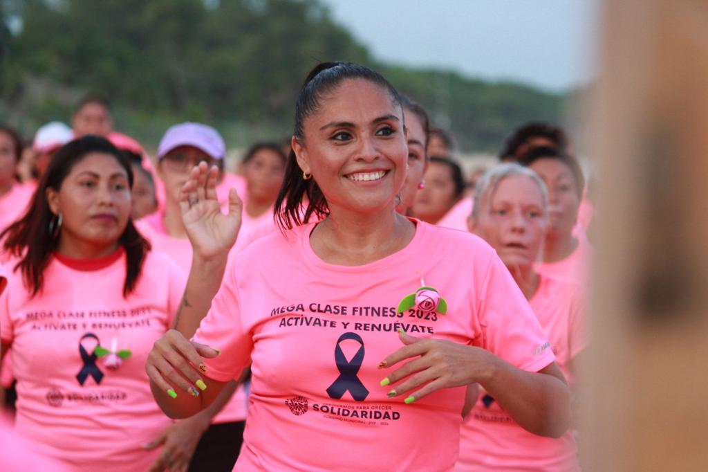 Playa del Carmen, Solidaridad, Q. Roo a 19 de octubre de 2023.- Con una megaclase de baile fitness a la orilla del mar Caribe, cientos de solidarenses, en su mayoría mujeres, se reunieron para conmemorar con ritmo y alegría el Día Rosa, en el que se recuerda la importancia de la lucha contra el cáncer de mama, la actividad se realizó en la Playa 72 y se contó con la presencia de la presidenta municipal de Solidaridad , Lili Campos, quien se unió al baile fitness y convivió con los participantes, compartiendo el mensaje de ánimo y fuerza para aquellas que han sobrevivido al cáncer de mama y hoy son un ejemplo de vida.