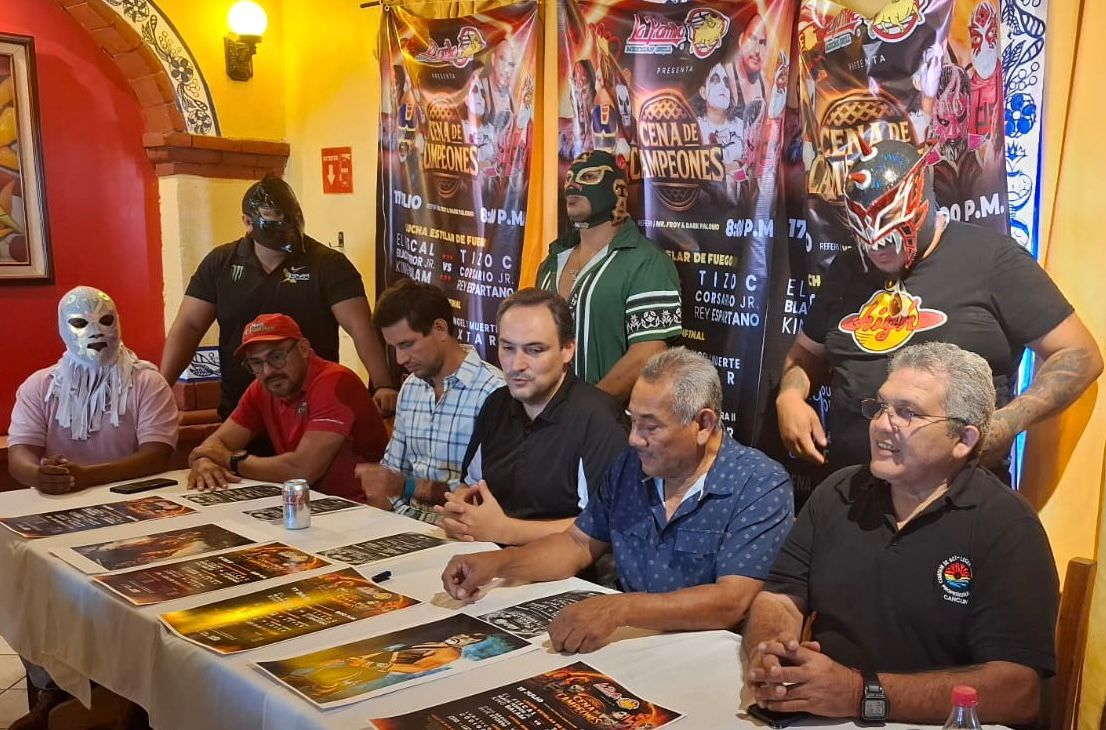 Este medio día en las instalaciones del emblemático restaurante del centro de Cancún, se dieron los detalles en torno a esta cuarta función, en una rueda de prensa encabezada por Amador Gutiérrez Guigui, promotor de Lucha Libre Cancún (LLC), quien estuvo acompañado de Luis García, director general de Cancún Food Tours, además de Florentino López y Armando “Taurus” Góngora, representantes de la Honorable Comisión de Boxeo, Lucha Libre y Artes Marciales Mixtas del municipio de Benito Juárez.