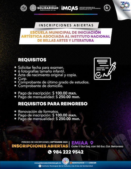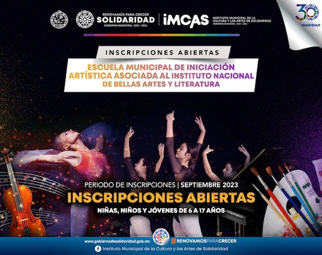 Playa del Carmen, Solidaridad, 23 de agosto del 2023.- Con el propósito de que niños, niñas y jóvenes de entre 6 y 17 años de edad conozcan los diferentes lenguajes del arte y estudien el que más les interese, el gobierno que encabeza Lili Campos mantiene abiertas las inscripciones a la Escuela de Iniciación Artística Asociada al Instituto Nacional de Bellas Artes y Literatura (INBAL), mismas que cerrarán el 8 de septiembre próximo.