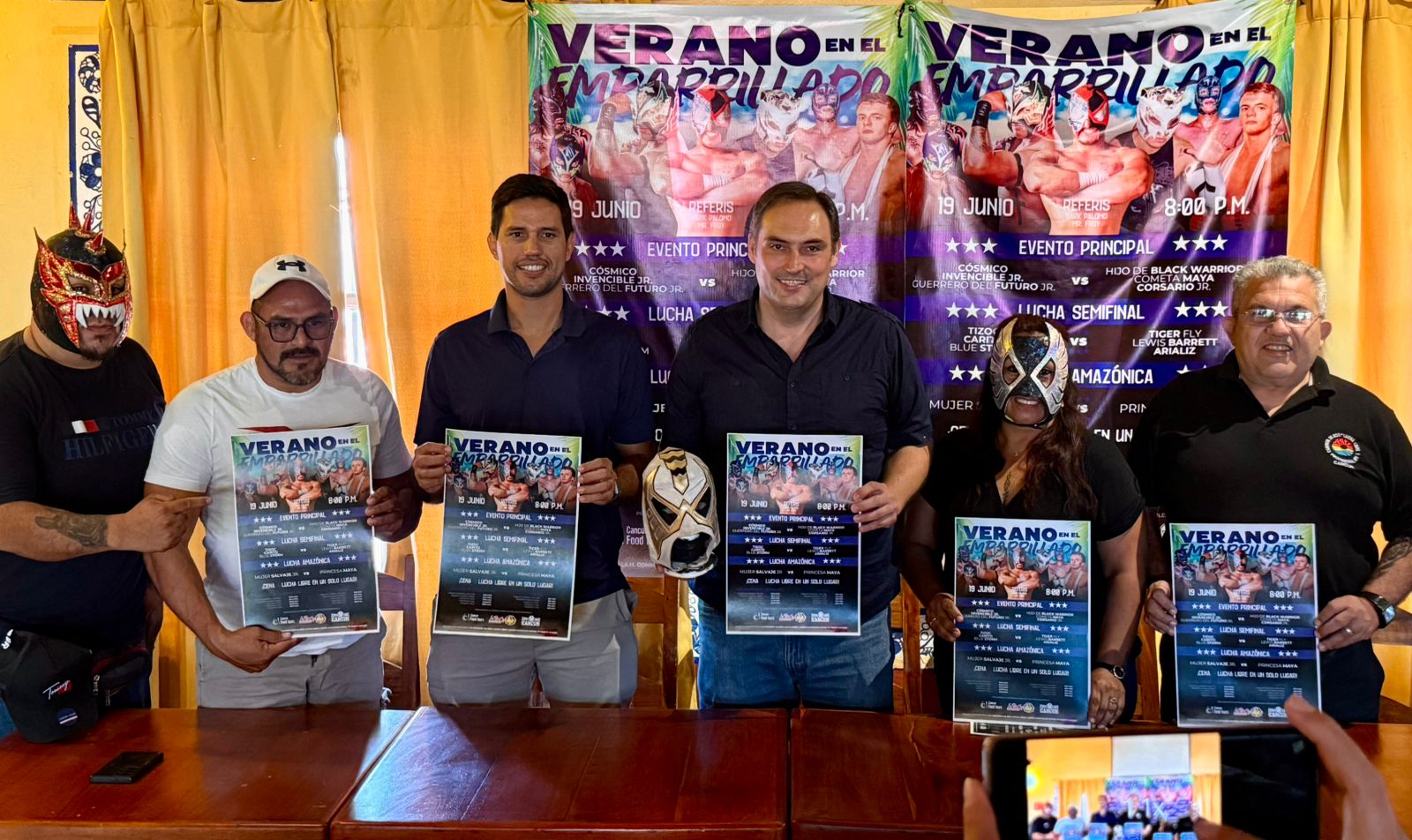 Debido a ello la tarde de este martes, se llevó a cabo la rueda de prensa para presentar dicha función, y en la que estuvieron presentes Amador Gutiérrez Guigui, responsable de la promotora Lucha Libre Cancún (LLC); acompañado por Luis García, director de Cancún Food Tours, además de Florentino López, titular de la Honorable Comisión de Box, Lucha Libre y Artes Marciales Mixtas del municipio de Benito Juárez, al igual que el ex luchador Armando “Taurus” Góngora y algunos exponentes locales del pancracio que estarán en la cartelera.