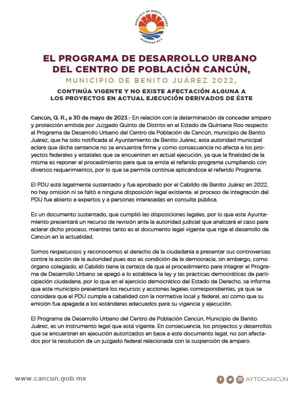 Cancún, Q. R., a 30 de mayo de 2023.- En relación con la determinación de conceder amparo y protección emitida por Juzgado Quinto de Distrito en el Estado de Quintana Roo respecto al Programa de Desarrollo Urbano del Centro de Población de Cancún, municipio de Benito Juárez, que ha sido notificada al Ayuntamiento de Benito Juárez, esta autoridad municipal aclara que dicha sentencia no se encuentra firme y como consecuencia no afecta a los proyectos federales y estatales que se encuentran en actual ejecución, ya que la finalidad de la misma es reponer el procedimiento para que se emita el referido programa cumpliendo con diversos requerimientos, por lo que se permite continúe aplicándose el referido Programa.