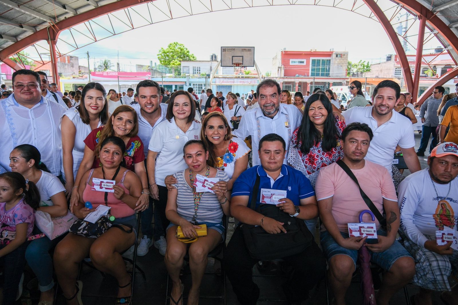 Dos de las primeras beneficiarias que recibieron sus tarjetas del bienestar fueron Mirna Vázquez y Mary Cahum, quienes acompañaron a la titular del Ejecutivo, al igual que la presidenta honoraria del Sistema DIF, Verónica Lezama Espinosa; el diputado Renán Sánchez Tajonar, presidente de la Junta de Gobierno y Coordinación Política del Congreso del Estado; el secretario de Salud, Flavio Carlos Rosado; la diputada federal Anahí González Fernández; el director de la Fundación de Parques y Museos de Cozumel, José Luis Chacón Méndez, y los diputados Humberto Aldana Navarro y Mildred Ávila Vera.
