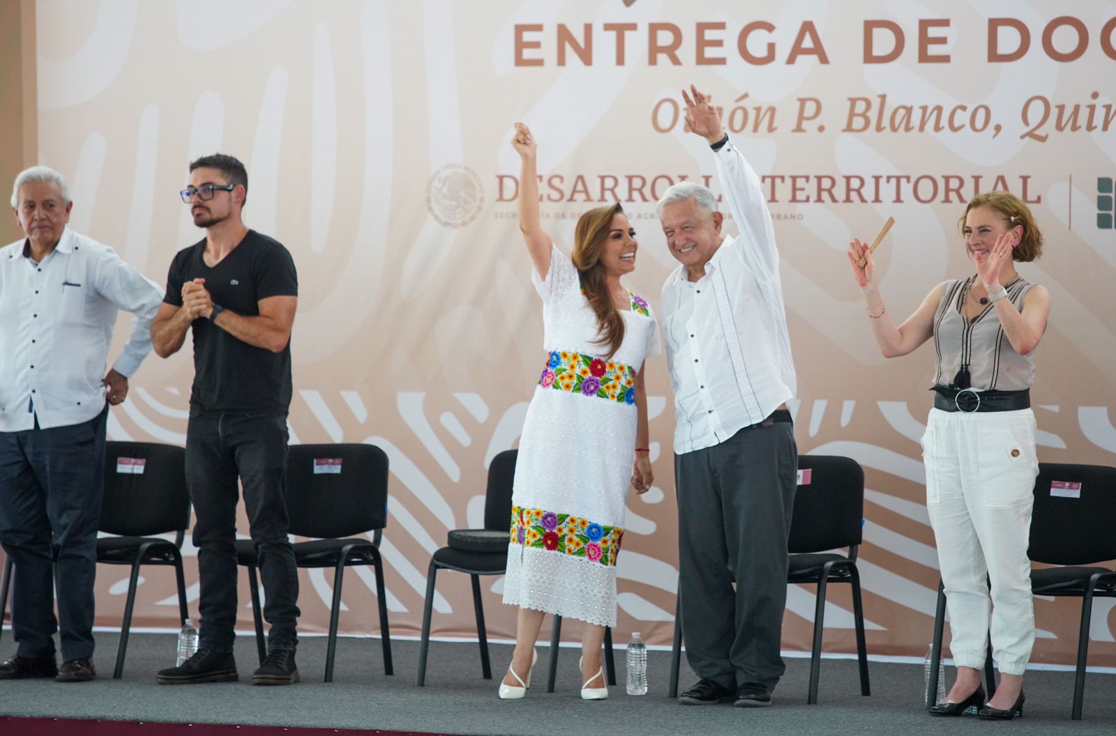 Chetumal.- La gobernadora Mara Lezama Espinosa acompañó al presidente Andrés Manuel López Obrador en la entrega de documentos del programa “Mujeres por el Acceso a la Tierra”, en cumplimiento de sentencias agrarias en favor de mujeres en el estado de Quintana Roo, un hecho histórico para la justicia social.