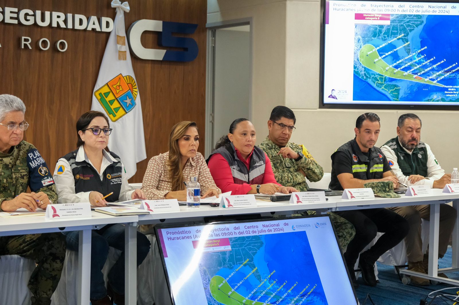 Cancún.- Encabezado por la gobernadora Mara Lezama Espinosa y acompañada por la coordinadora nacional de Protección Civil Laura Velázquez Alzúa, el Consejo Estatal de Protección Civil sesionó de forma extraordinaria en atención y seguimiento al huracán “Beryl”.
