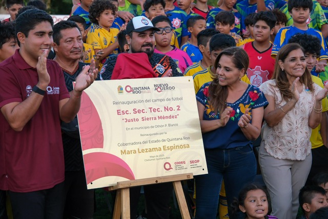 Chetumal, Quintana Roo; 25 de mayo 2025.- Al entregar el campo de fútbol de la Escuela Secundaria Técnica No. 2 “Justo Sierra Méndez”, una institución de 61 años de historia en Chetumal, la gobernadora Mara Lezama Espinosa expresó que cada cancha renovada, cada campo entregado, cada unidad deportiva rehabilitada es una batalla que ganamos las y los quintanarroenses en pro de la construcción de la paz.