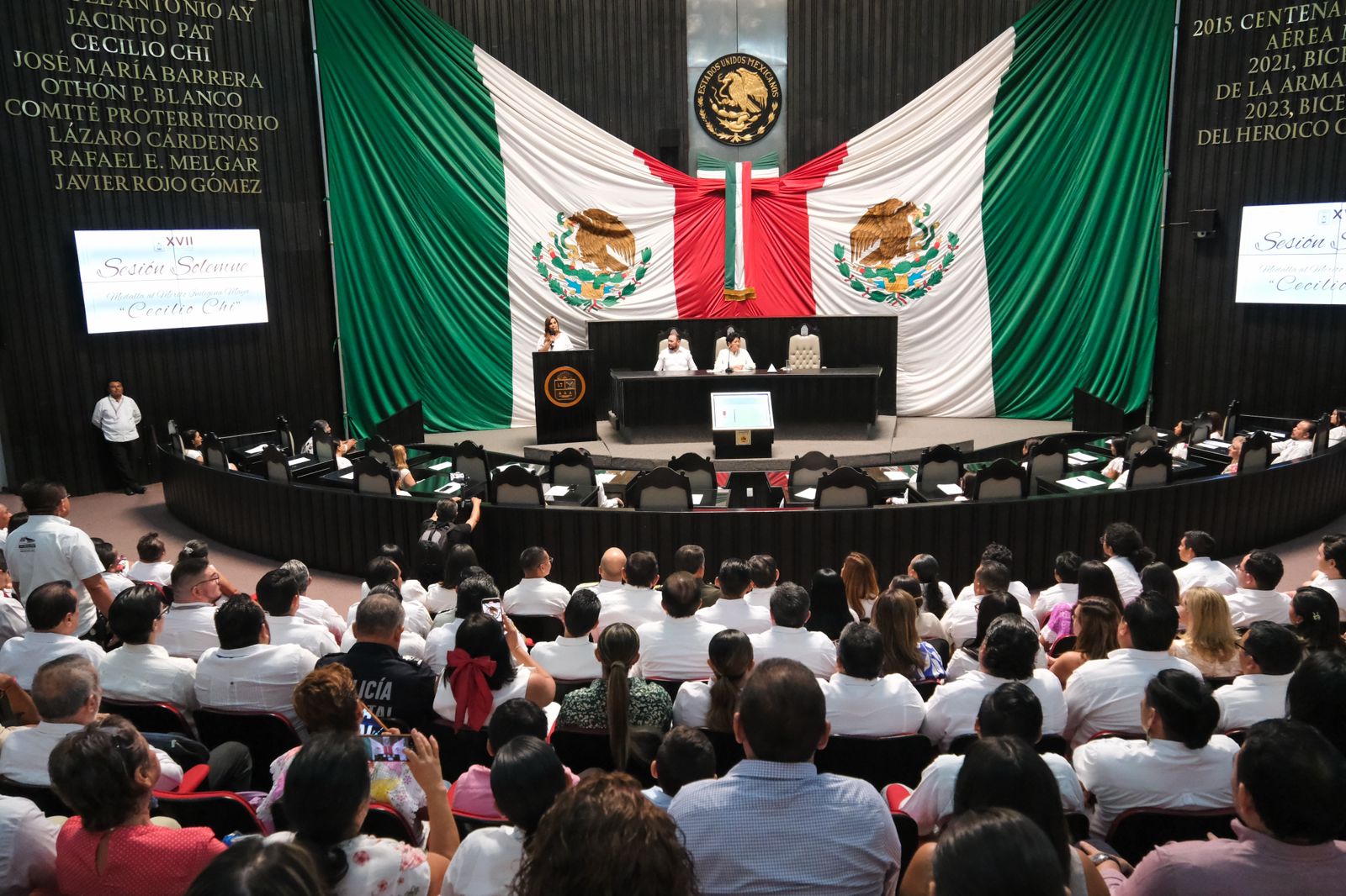 Durante la sesión, presidida por la diputada Yohanet Torres Muñoz, presidenta de la mesa directiva, y en la estuvieron la presidenta honoraria del Sistema DIF Quintana Roo, Verónica Lezama Espinosa, sacerdotes y generales mayas, representantes de los sectores, presidentes municipales, autoridades militares, y público en general, la diputada Mirella Betesda Díaz Aguilar leyó el Decreto de Creación de la Medalla “Cecilio Chí”.
