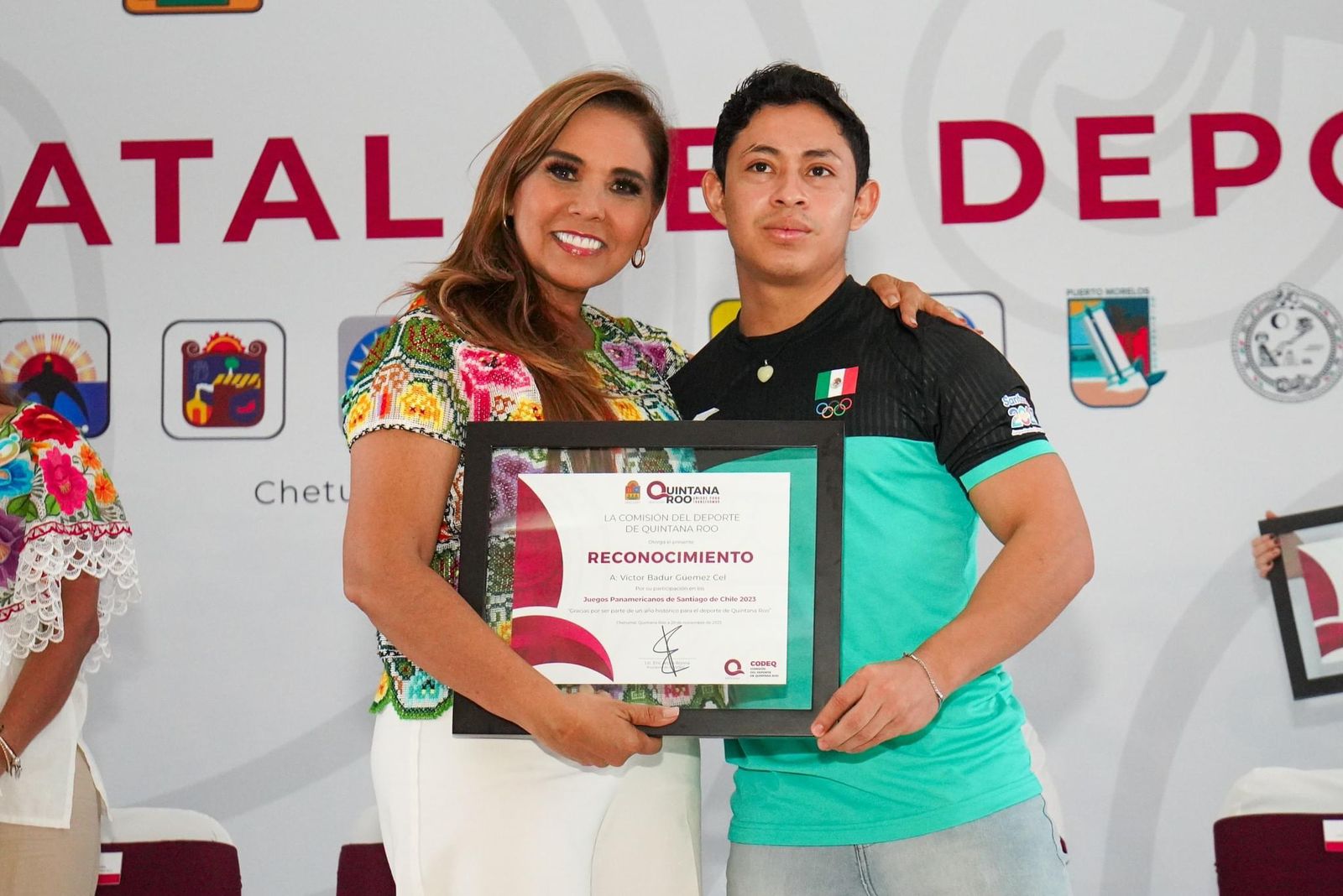 El momento más emotivo fue cuando la gobernadora Mara Lezama, acompañada de Eric Arcila Arjona, presidente de la Comisión del Deporte de Quintana Roo (CODEQ), hicieron la entrega de del Premio Estatal del Deporte 2023, siendo los galardonados Swami Oshmara Mostalac Rizzitiello, en Deportistas Convencional Femenil de la disciplina de breaking; así como Víctor Badur Güemez Cel, de levantamiento de pesas como Deportista Convencional Varonil.