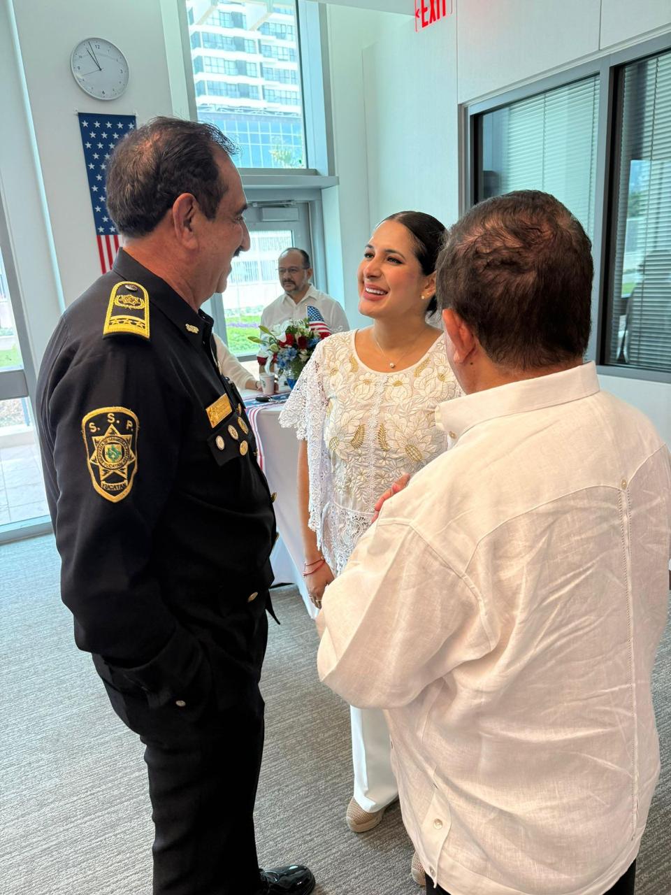 Mérida, Yucatán, 27 de junio de 2025.— En el marco de la celebración del Día de la Independencia de los Estados Unidos, en el Consulado en Mérida, la presidenta municipal de Playa del Carmen, Estefanía Mercado, sostuvo un encuentro con el secretario de Seguridad Pública de Yucatán, Luis Felipe Saidén Ojeda, con quien dialogó sobre los avances en seguridad que se están logrando en el municipio y las buenas prácticas que han hecho de Yucatán, un referente nacional en la materia.