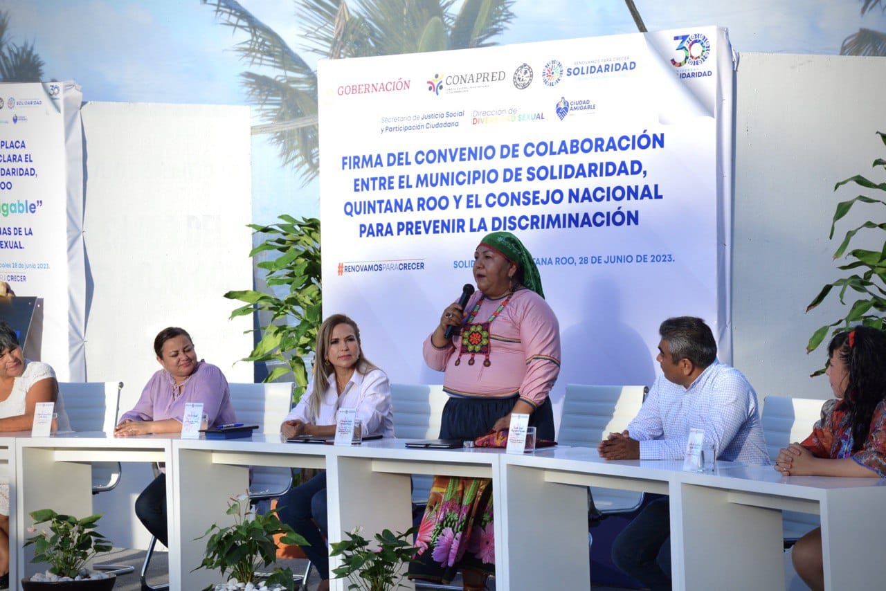 Playa del Carmen, Solidaridad a 28 de junio del 2023.- Con el objetivo de realizar trabajos en conjunto para el combate a la discriminación, el gobierno municipal que lidera la presidenta Lili Campos firmó un convenio con el Consejo Nacional para Prevenir la Discriminación (Conapred), al tiempo de la develación de la placa con la que se declara a Solidaridad “Ciudad amigable” con las personas de la diversidad sexual.