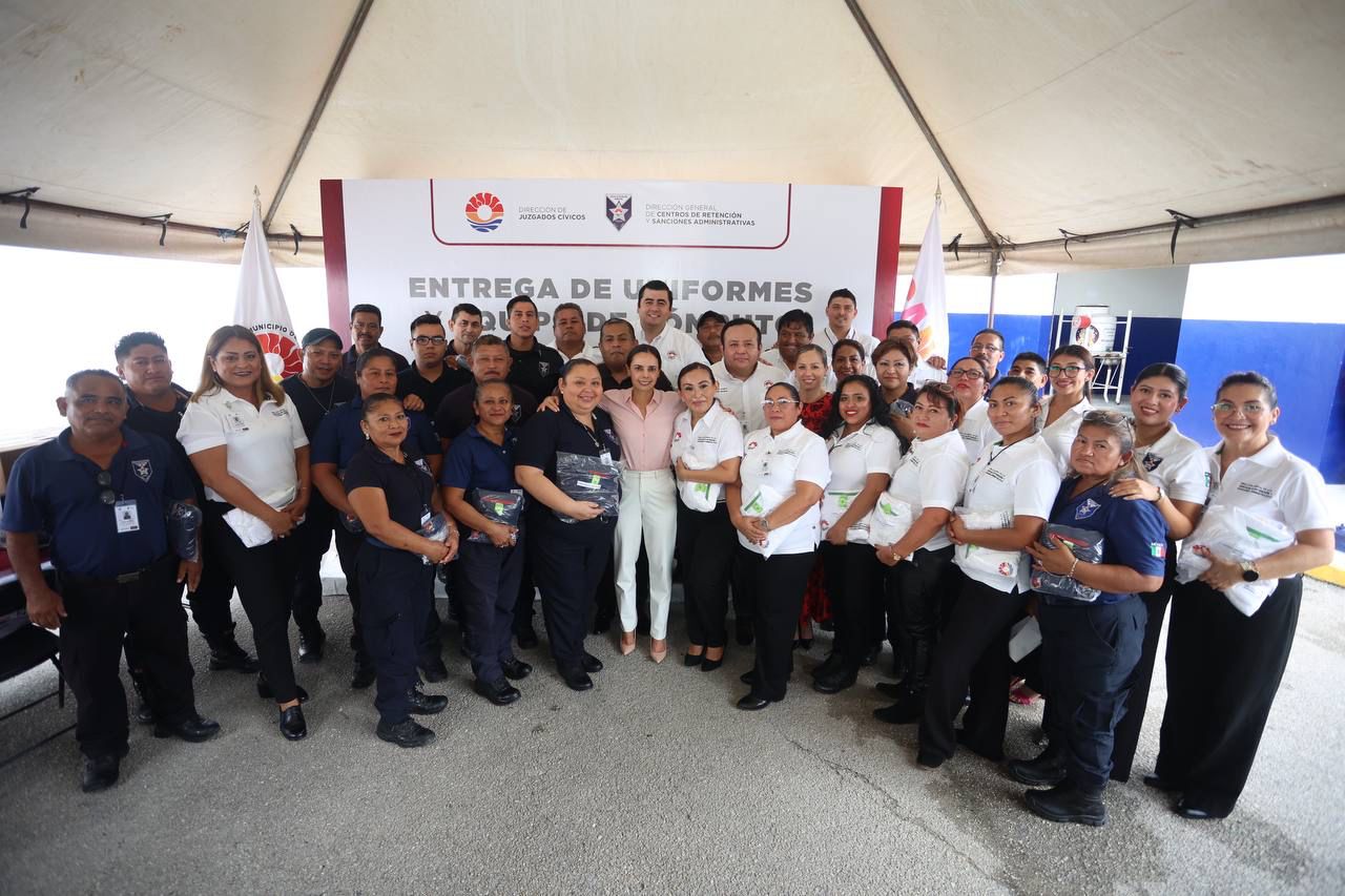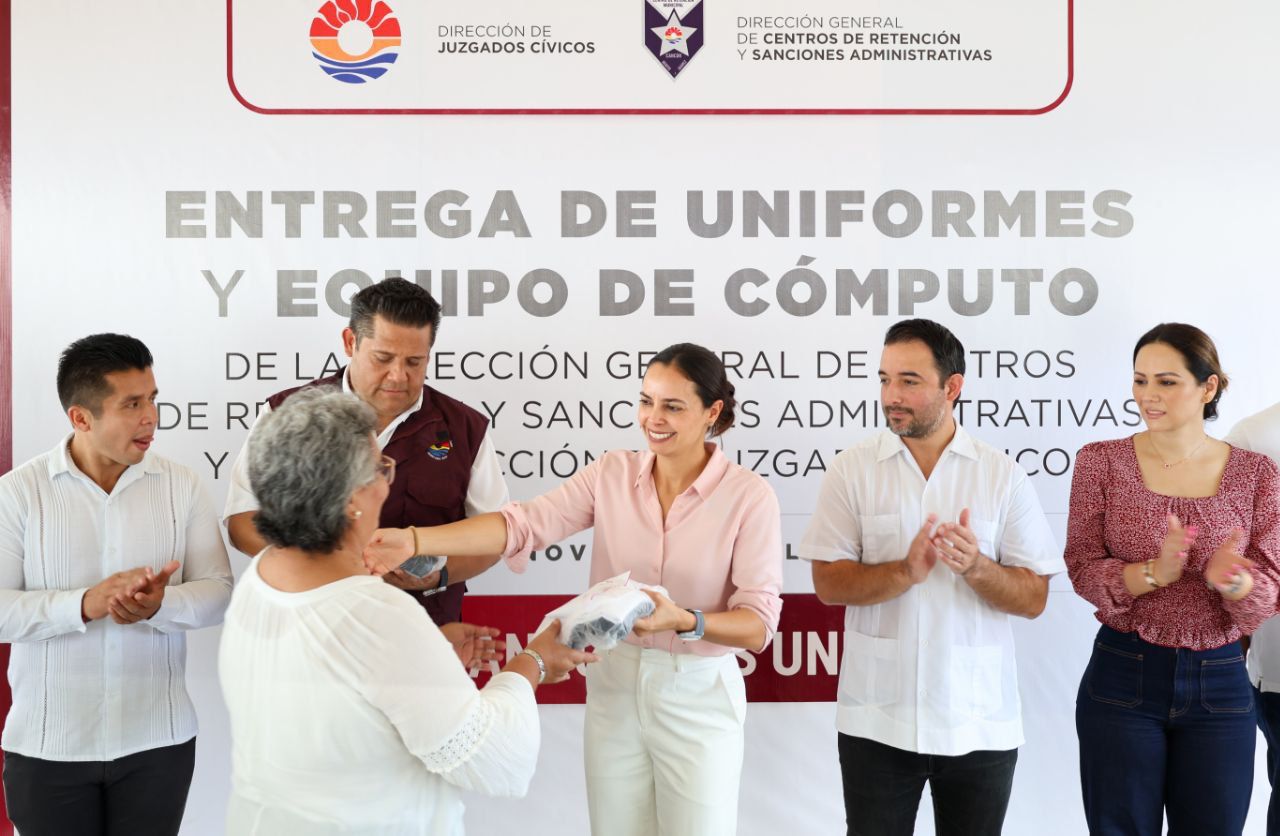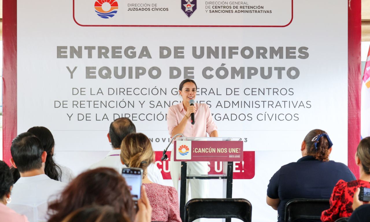 Cancún, Q. R., a 15 de noviembre de 2023.- Como parte de la dignificación de las dependencias para eficientar la labor y ofrecer un mejor servicio a los ciudadanos, la Presidenta Municipal, Ana Paty Peralta, entregó uniformes y equipo de cómputo a personal del Centro de Retención y Sanciones Administrativas, así como al de los Juzgados Cívicos, además constató los avances en la construcción de la sala de juicios orales al interior de ese recinto ubicado en la Supermanzana 247.