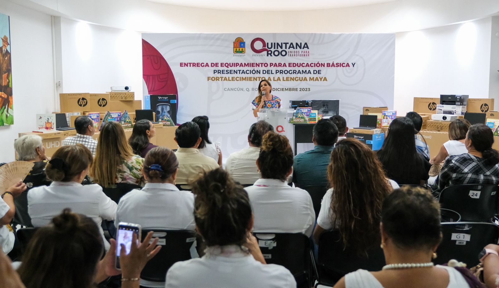 Cancún.- Con inversión de más de 53 millones de pesos, la gobernadora Mara Lezama Espinosa entregó equipamiento para la educación básica y presentó el Programa de Fortalecimiento de la Lengua Maya, herramientas que se necesitan para darle educación de calidad a las niñas y niños quintanarroenses, así como para reforzar la identidad cultural.