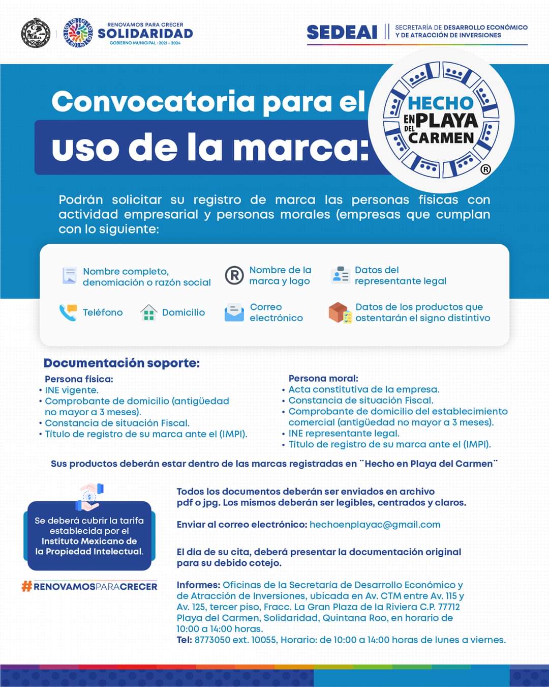 Entre los requisitos están que todos los productos deben pertenecer a las categorías de marcas registradas en “Hecho en Playa del Carmen”, además deberán cubrir la tarifa establecida por el Instituto Mexicano de la Propiedad Intelectual, entre otros.