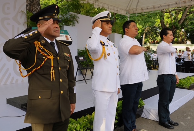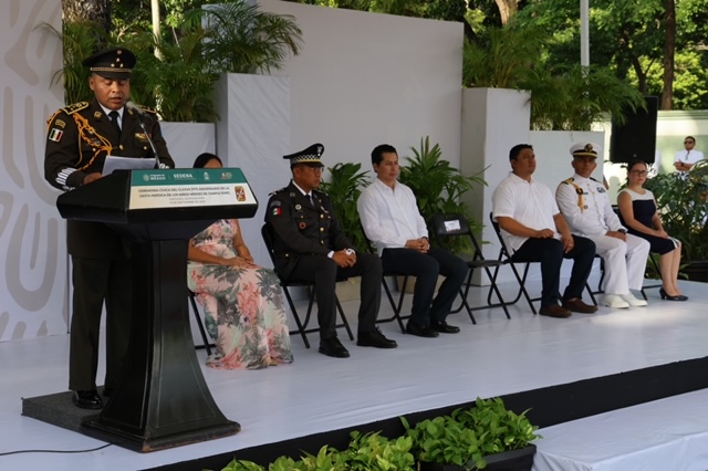 Chetumal.- En el marco de las Fiestas Patrias 2024, la Comandancia de la 34 Zona Militar en coordinación con el Gobierno del Estado llevó a cabo la ceremonia cívica en la capital, para conmemorar el CLXXVII (177) aniversario de la Gesta Heroica de los Niños Héroes de Chapultepec, acto que fue encabezado por el Secretario Ejecutivo del Sistema Estatal de Seguridad Publica, Adrián Martínez Ortega, en representación de la gobernadora Mara Lezama Espinosa.
