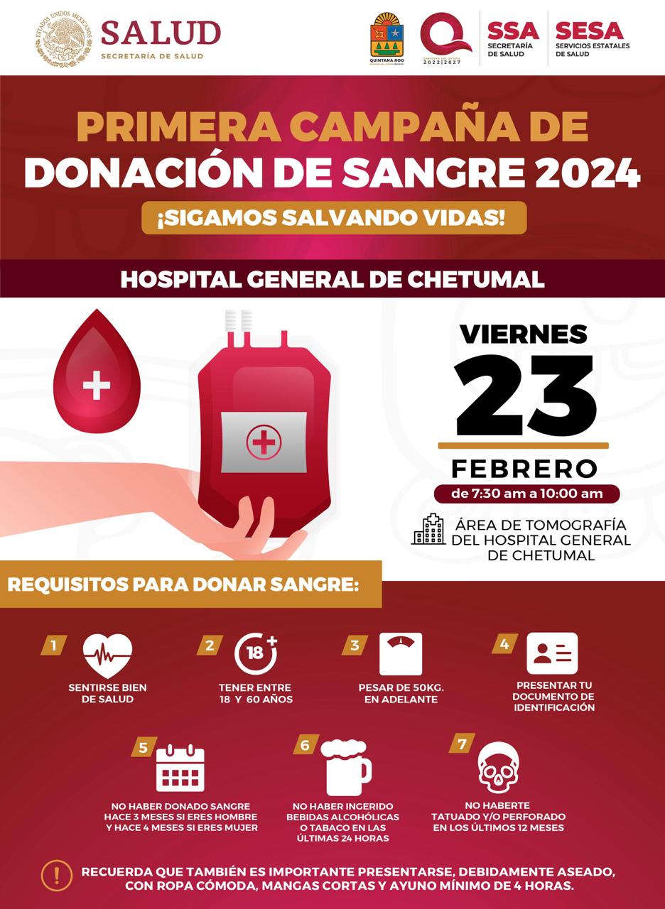 Chetumal. – La Secretaría de Salud de Quintana Roo invita a la población a participar en la “Primera Campaña de Donación de Sangre 2024” que se realizará en el Hospital General de Chetumal, este viernes 23 de febrero, de 7:30 a 10:00 horas de la mañana.