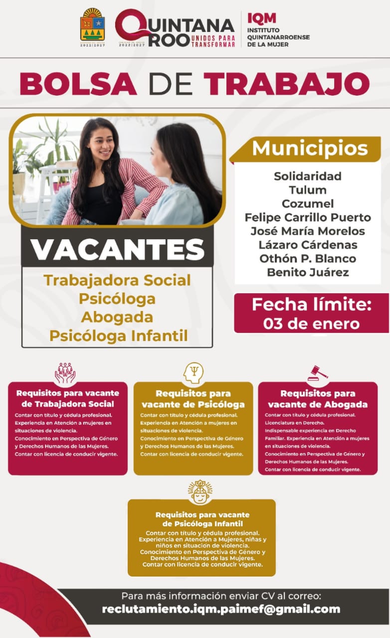 Chetumal.- El Instituto Quintanarroense de la Mujer (IQM), da a conocer la convocatoria para que profesionistas psicólogas, abogadas y trabajadoras sociales interesadas en ofrecer sus servicios para la atención de las mujeres en situación de violencia, se integren a su equipo dentro de la estrategia Somos Tu Red de Apoyo, fortaleciendo así a los PAIMEF 2024 en 8 municipios de Quintana Roo.