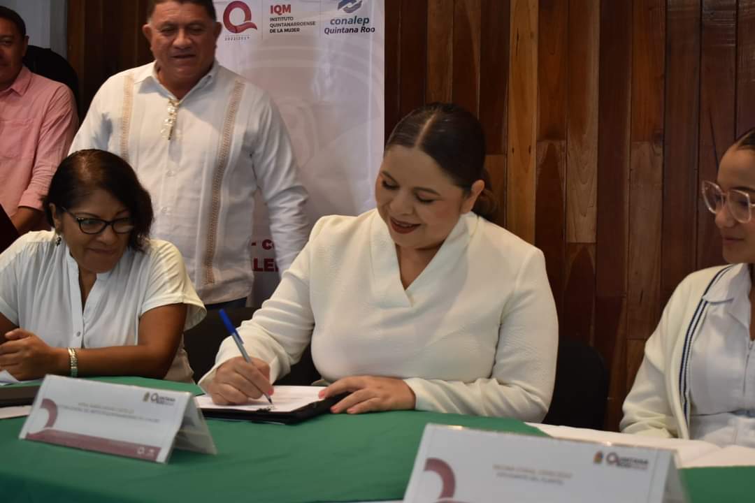 Chetumal.- El Instituto Quintanarroense de la Mujer (IQM) y el Colegio Nacional de Educación Profesional Técnica (CONALEP), firmaron un convenio de colaboración, con el objetivo de acelerar los procesos de empoderamiento y liderazgo de las estudiantes mediante acciones conjuntas que se realizarán en el ámbito educativo y en la promoción de los derechos de las mujeres.