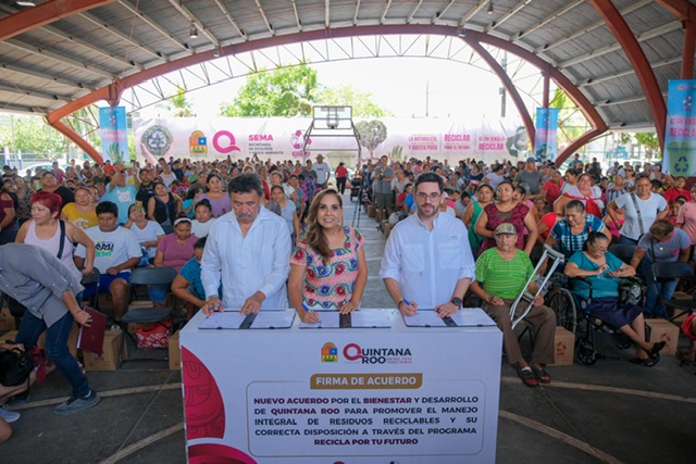 Durante la jornada de intercambio “Recicla por tu Futuro” se firmó el Nuevo Acuerdo por el Bienestar y Desarrollo de Quintana Roo para promover el Manejo Integral de Residuos Reciclables, a través de la SEMA, con capacitación en temas de manejo integral de residuos, para contar con un medio ambiente sano para su desarrollo y calidad de vida.