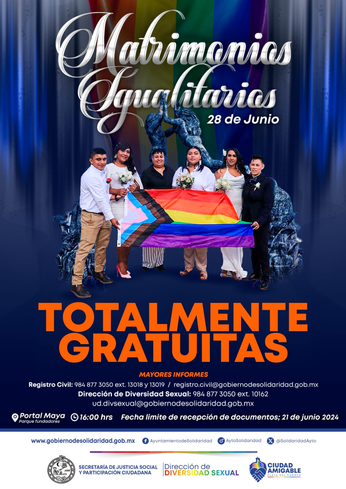 Junny López García, directora de Diversidad Sexual, señaló que las parejas de la comunidad LGBTTTIQ+ que participen en los matrimonios igualitarios, podrán realizar los trámites ante el Registro Civil de forma gratuita, teniendo como fecha límite de recepción de documentos el 21 de junio. El evento se realizará el 28 de junio, en el Portal Maya.