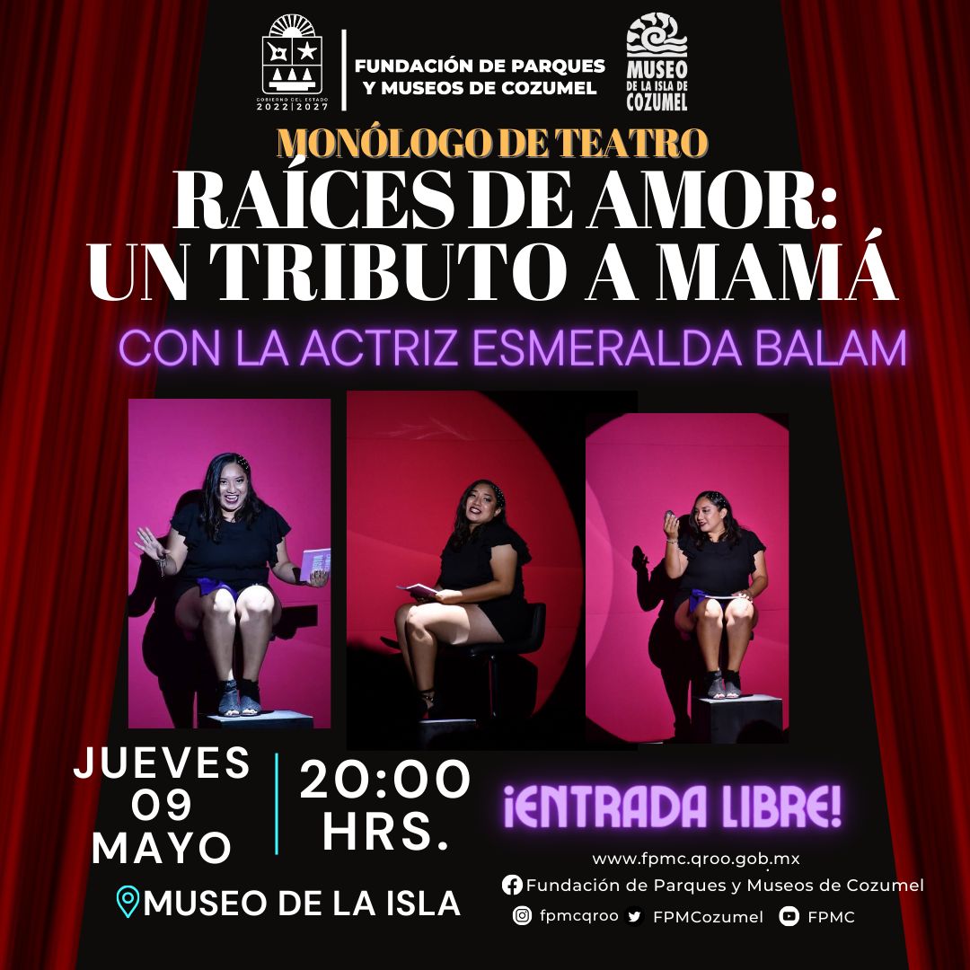 Cozumel a 04 de Mayo del 2024.- En el marco del Día de las Madres, la Fundación de Parques y Museos de Cozumel (FPMC) invita al público en general la noche del jueves a disfrutar en el auditorio del Museo de la Isla, la presentación del monólogo de teatro “Raíces de Amor: Un Tributo a Mamá”, interpretado por la actriz cozumeleña Esmeralda Balam.