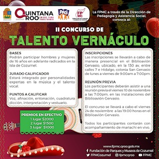 Cozumel.- Luego del rotundo éxito de la primera edición del concurso “Talento Vernáculo”, dirigido a personas mayores de 16 años de edad que radiquen en Cozumel, la Fundación de Parques y Museos de Cozumel (FPMC) anuncia la convocatoria de la segunda edición del evento que se llevará a cabo el próximo 24 de noviembre, en la concha acústica del BiblioAvión Gervasio.