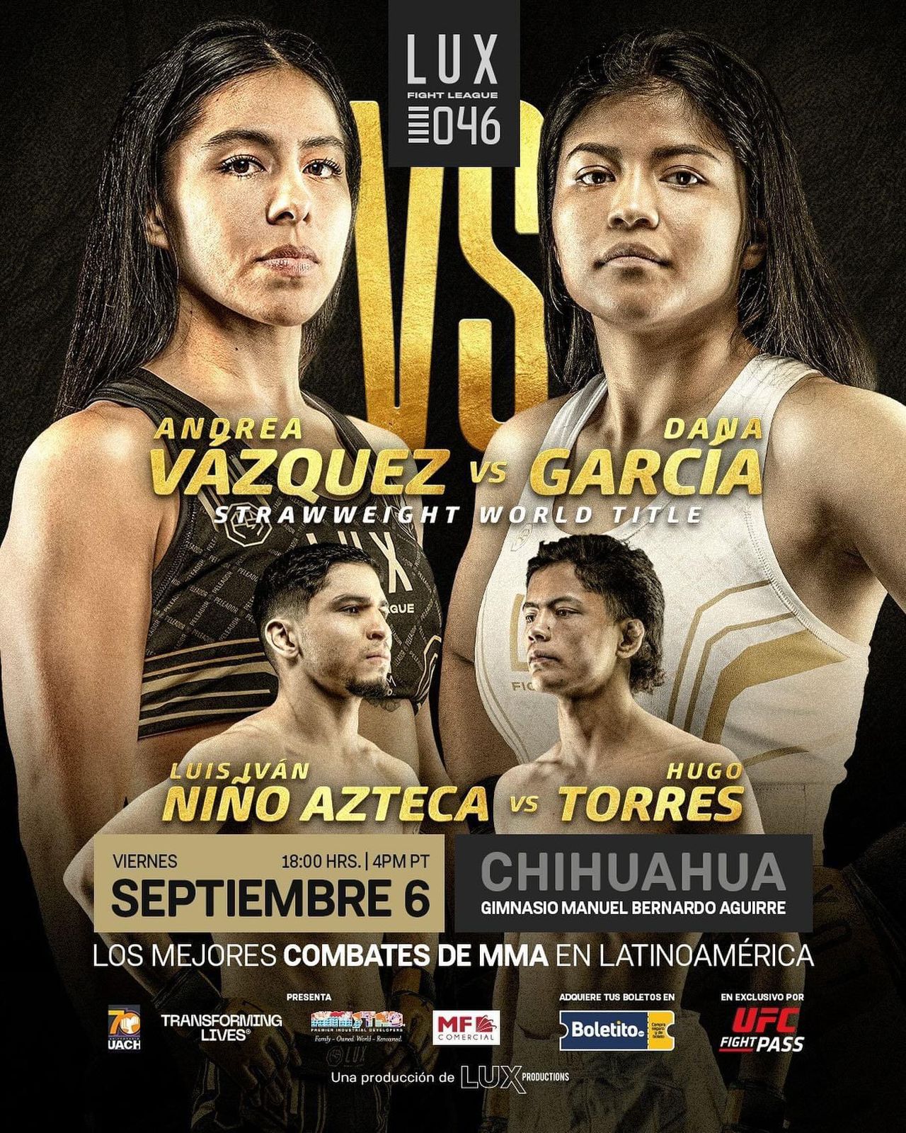 La edición LUX 046, del próximo 06 de septiembre se realizará en el Gimnasio Manuel Bernardo Aguirre, estará presentando ante el público chihuahuense, el choque principal por el título de peso paja entre la playense Andrea Vázquez y Dana García, un combate que pondrá, cara a cara, a dos de las grandes figuras femeniles de la organización que buscan tomar el cetro tras la marcha de Saray Orozco a PFL.