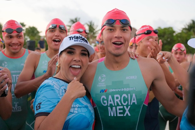Mara Lezama y Ana Paty Peralta dan banderazo de salida a competidores del Triatlón Astri Cancún 2025
