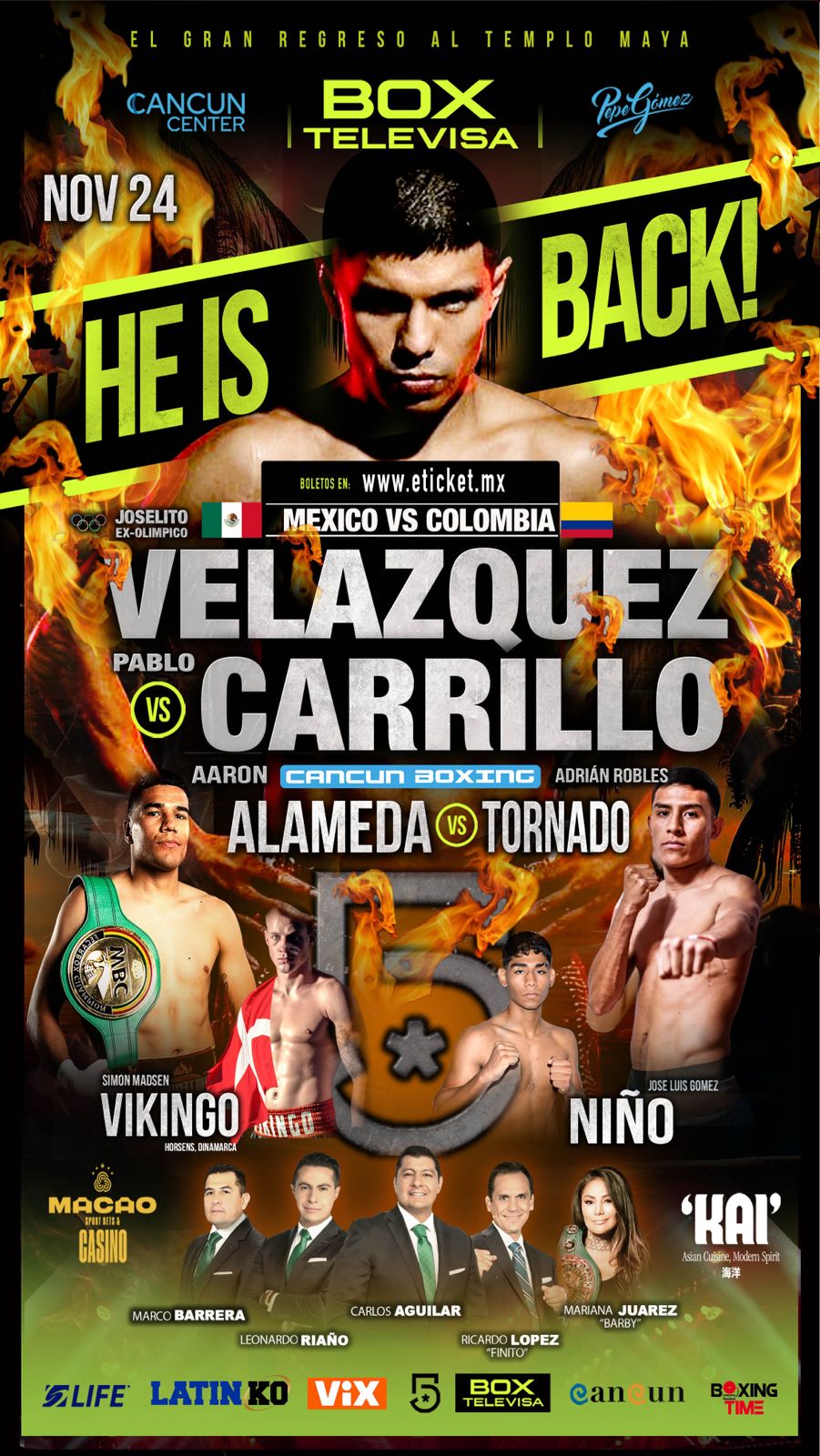 Cancún, Quintana Roo.- En una importante producción conjunta que ofrecen las empresas “Cancún Boxing”, que preside Pepe Gómez; “Latin KO Promotions”, dirigida por Oswaldo Kuchle; y “Boxing Time Promotions”, a cargo de Guillermo Rocha, el “Huracán” cancunense Joselito Velázquez realizará su retorno sobre cuadriláteros cancunenses tras poco más de seis años de ausencia. Este jueves, en ceremonia de pesaje realizada en las instalaciones del Casino Macao Cancún, que fue conducida por el promotor Pepe Gómez con el aval del comisionado Florentino López, Velázquez Altamirano cumplió con el trámite del peso rumbo al duelo que sostendrá este viernes 24 contra el colombiano Pablo “Trencito” Carrillo en la batalla estelar de la gala boxística “He is Back” que se disputará a partir de las 19:00 horas en el “Cancun Center Conventions & Exhibitions” con transmisión a cargo de Televisa Univisión hacia América Latina y Estados Unidos. Joselito (17 triunfos, un revés, un empate y 12 nocauts), que ganó dos medallas de oro en los Juegos Panamericanos, en Guadalajara 2011 y Toronto 2015, y representó a México en los Juegos Olímpicos de Río 2016; es hoy por hoy uno de los más sólidos contendientes en la división Mosca, donde se ubica entre los elegibles para disputar la corona del orbe en un muy corto plazo, pero antes deberá superar al duro contendiente colombiano Pablo Carrillo (28 victorias, 9 derrotas, 2 empates y 17 nocauts). Enfrente tendrá un oponente de gran experiencia sobre los cuadriláteros del mundo, por lo que el combate resultará intenso, sumamente disputado y será sin lugar a dudas del agrado de los fanáticos que exigen ver a los mejores enfrentando a los mejores, y Carrillo ha demostrado ser un rival que impone condiciones como lo hizo en cada una de las cinco veces que ha enfrentado a campeones del mundo. Durante la ceremonia de peso, el “Huracán” cancunense registró 49.700 kilogramos, mientras que el “Trencito” colombiano marcó 50 kilos exactos.