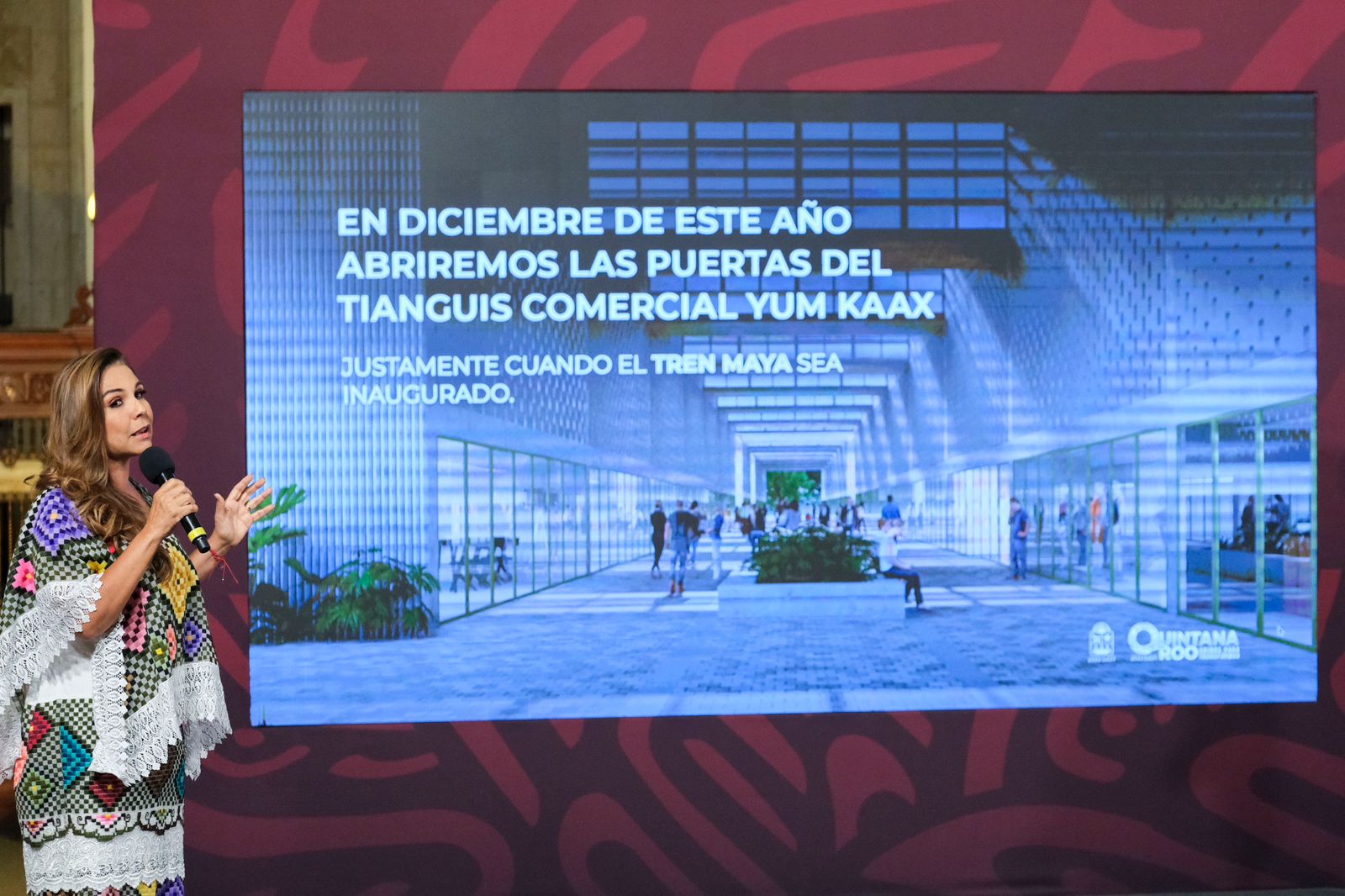 *Ciudad de México a 18 de septiembre del 2023.- Durante la presentación de los avances de la construcción del Tren Maya en la conferencia matutina del presidente Andrés Manuel López Obrador, la gobernadora Mara Lezama anunció la creación del *Tianguis Comercial Yum Kaax*, un proyecto diseñado para la compra venta de productos regionales y de importación a bajo costo, con lo que se aprovechará la condición de zona libre de Chetumal, pero además le regresará el protagonismo a esta zona del caribe mexicano.