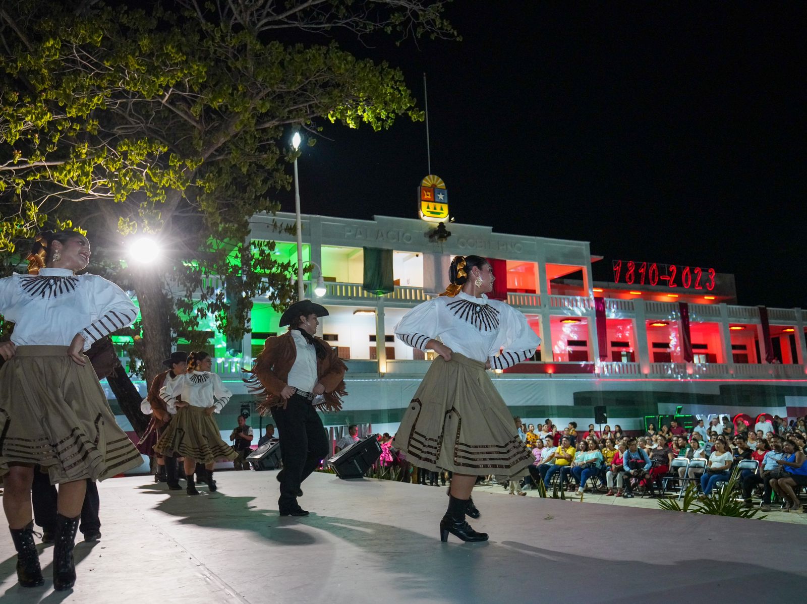 Chetumal.- La gobernadora Mara Lezama Espinosa encendió las luces y presenció el festival cultural “Noches Mexicanas” por el inicio de las Fiestas Patrias en la plaza cívica de La Bandera, frente a Palacio de Gobierno, en Chetumal, capital del estado.