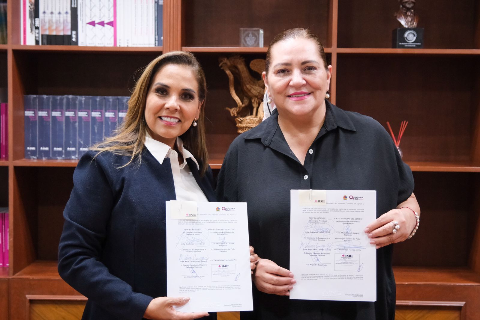 Participaron en la firma del convenio el Consejero Jurídico del Gobierno de Quintana Roo, Carlos Felipe Fuentes del Río; la encargada de Despacho de la Secretaría Ejecutiva del INE, María Elena Cornejo Esparza, y el director ejecutivo del Registro Federal de Electores del INE, Alejandro Sosa Durán.