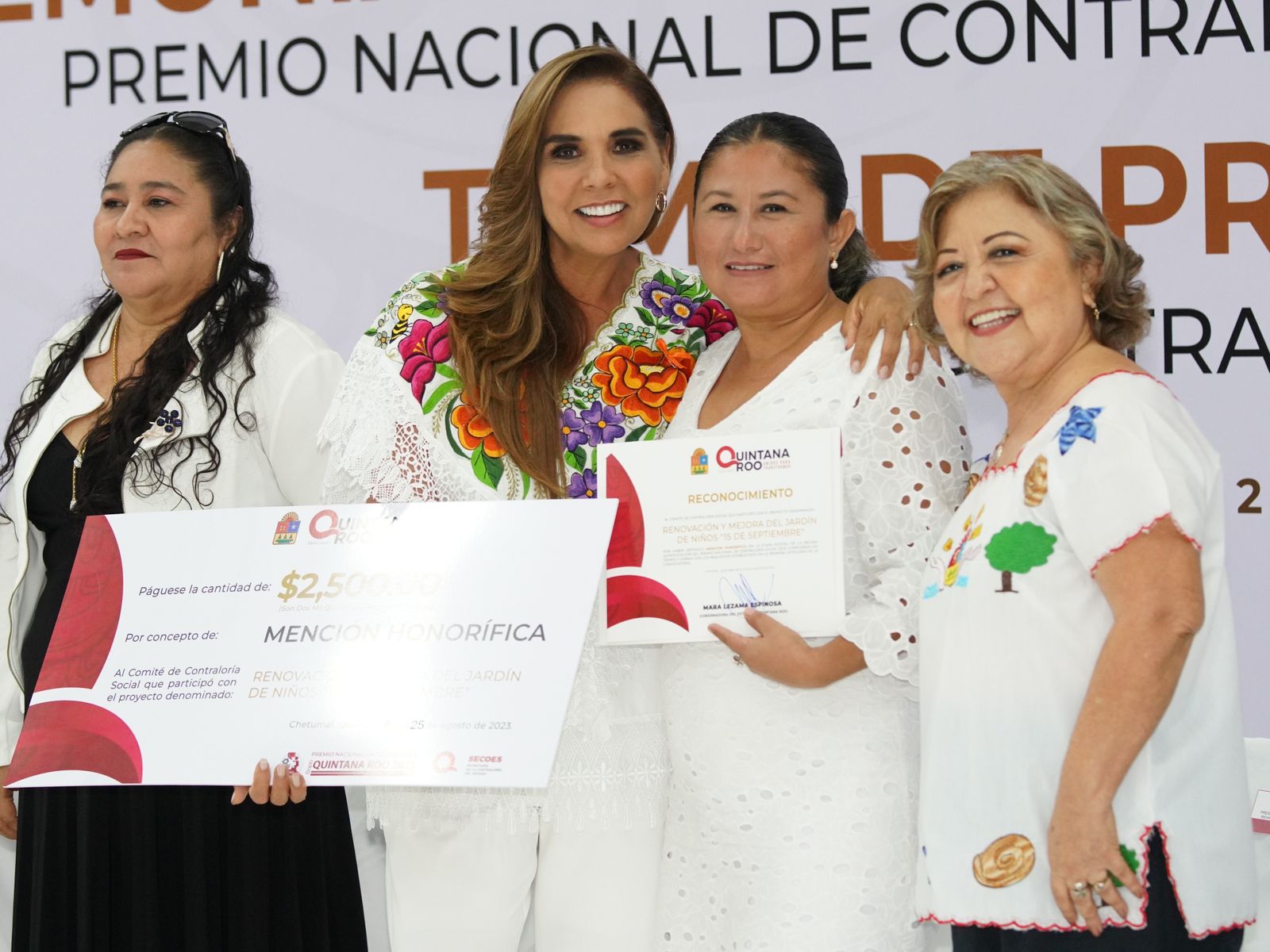 Chetumal.- En reconocimiento al trabajo que realizan de manera organizada en el seguimiento, supervisión y vigilancia social, la gobernadora Mara Lezama Espinosa entregó premios a los ganadores del XV Premio Nacional de Contraloría Social 2023, etapa Quintana Roo y, además, tomó protesta de los integrantes de nuevos Comités de Contraloría Social.