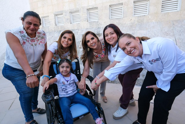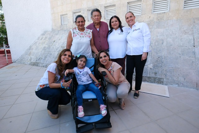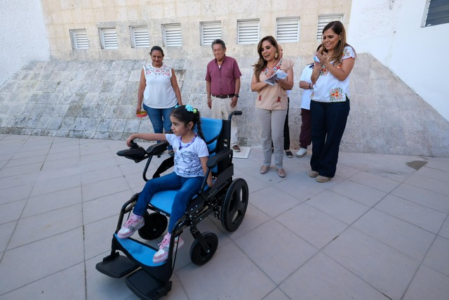 Chetumal.- La gobernadora Mara Lezama Espinosa y la presidenta honoraria del Sistema DIF Quintana Roo entregaron a la niña Roxana Naima Tejada Ronson su silla de ruedas eléctrica para que, al igual que otras niñas y niños, pueda tener una mejor calidad de vida.
