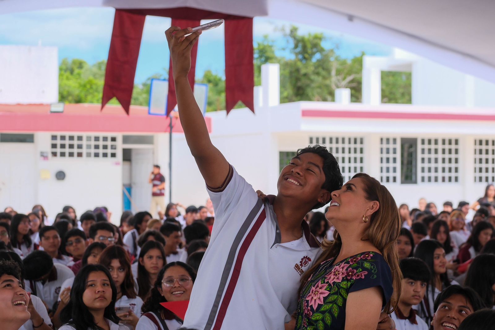 También acompañaron a la Gobernadora en este evento la presidenta municipal, Ana Patricia Peralta; la presidenta honoraria del Sistema DIF Quintana Roo, Verónica Lezama Espinosa; la diputada federal Anahí González; el secretario de Educación Carlos Gorocica Moreno; el director de control y supervisión de la DGTI, Alejandro Samuel Colín, y la directora del plantel, Aracely Romero Canales.
