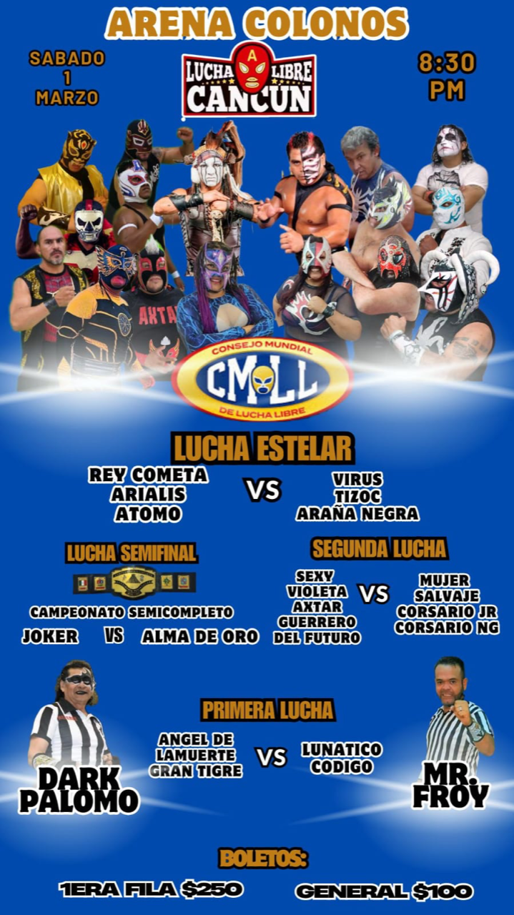 CANCÚN, Q. ROO a 20 de febrero.- La actividad del pancracio en este destino turístico no se detiene, tanto así que este día, la promotora Lucha Libre Cancún (LLC), hizo oficial su próximo cartel, mismo que se llevará a cabo el próximo sábado 1 de marzo en punto de las 20:00 horas en la “Arena Colonos” de la SM 89, con la presencia una vez más de contendientes estelares del Consejo Mundial de Lucha Libre (CMLL).