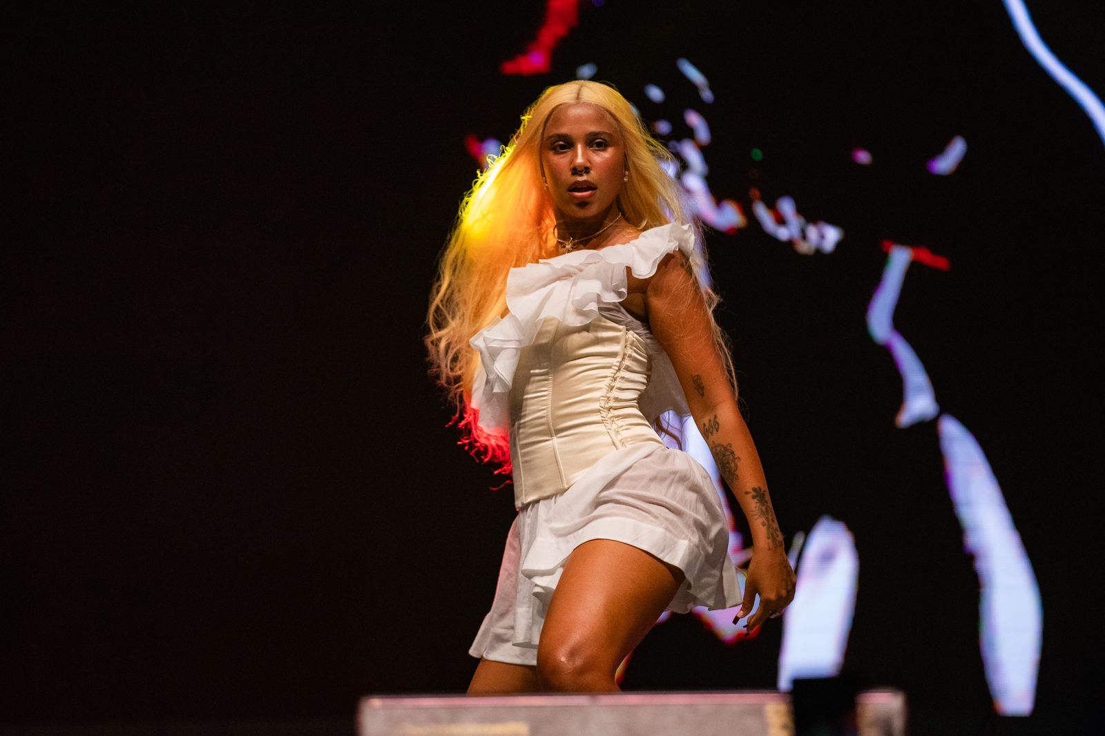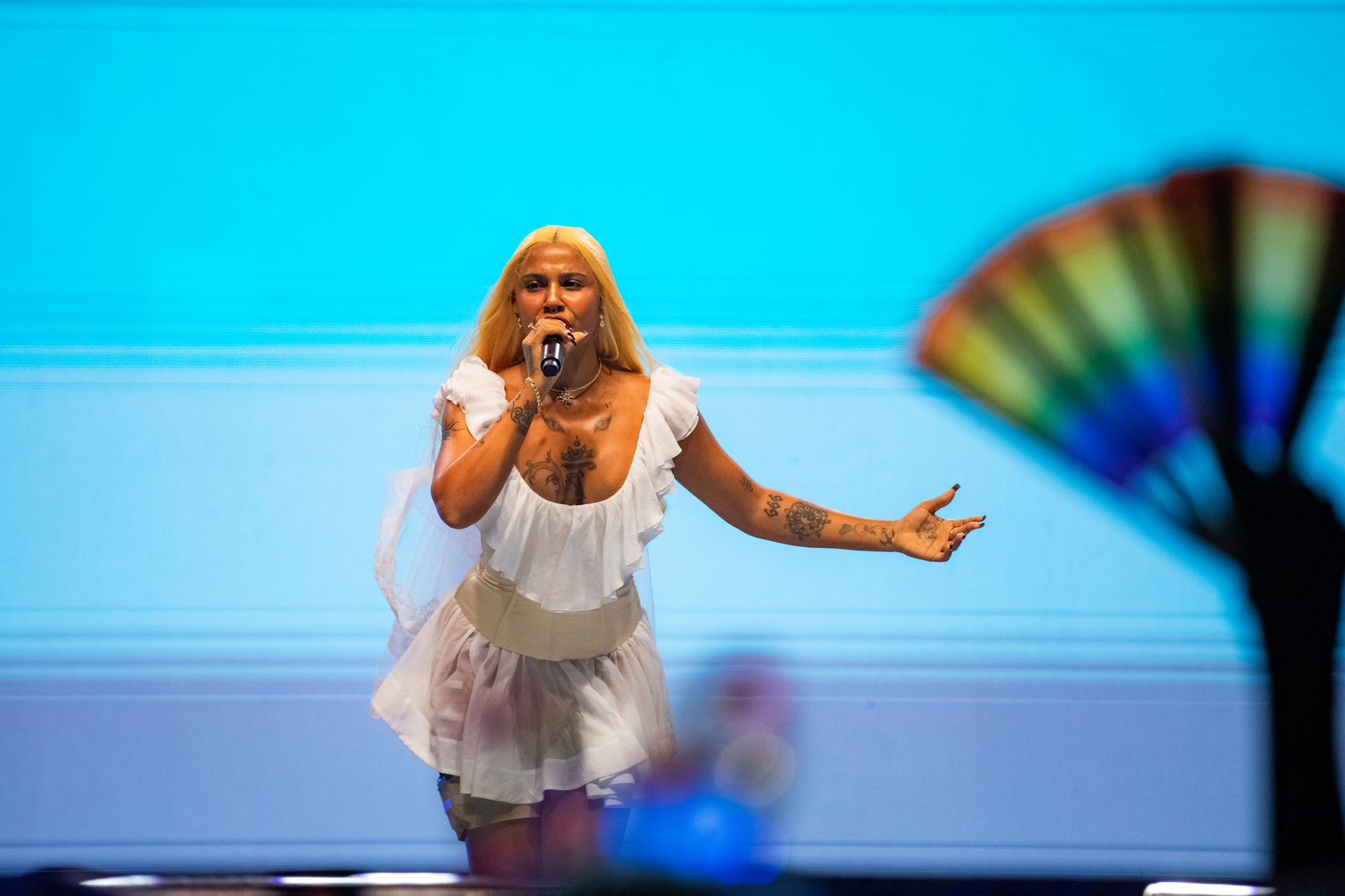 Minutos después, Tokischa hizo vibrar el escenario con temas como Linda, Delincuente, Estilazo, Chulo, Kilos de amor, Hola y Sistema de patio, encendiendo los ánimos de una audiencia eufórica.