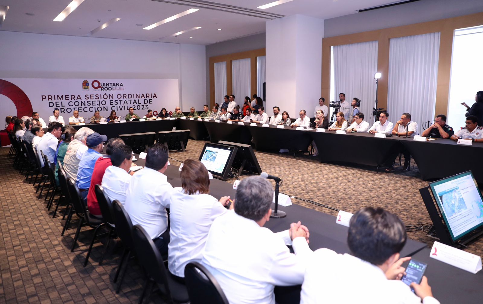 Ante representantes de los diversos sectores sociales, privado, público, empresarial, presidentes municipales, autoridades militares y navales, de Protección Civil, entre muchos más, la gobernadora Mara Lezama reiteró el compromiso del Gobierno del Estado y la confianza que hay en el trabajo de los otros poderes del Estado, los 11 municipios, los órganos autónomos, las autoridades federales y voluntarios, en la salvaguarda de la vida y patrimonio de las y los quintanarroenses.