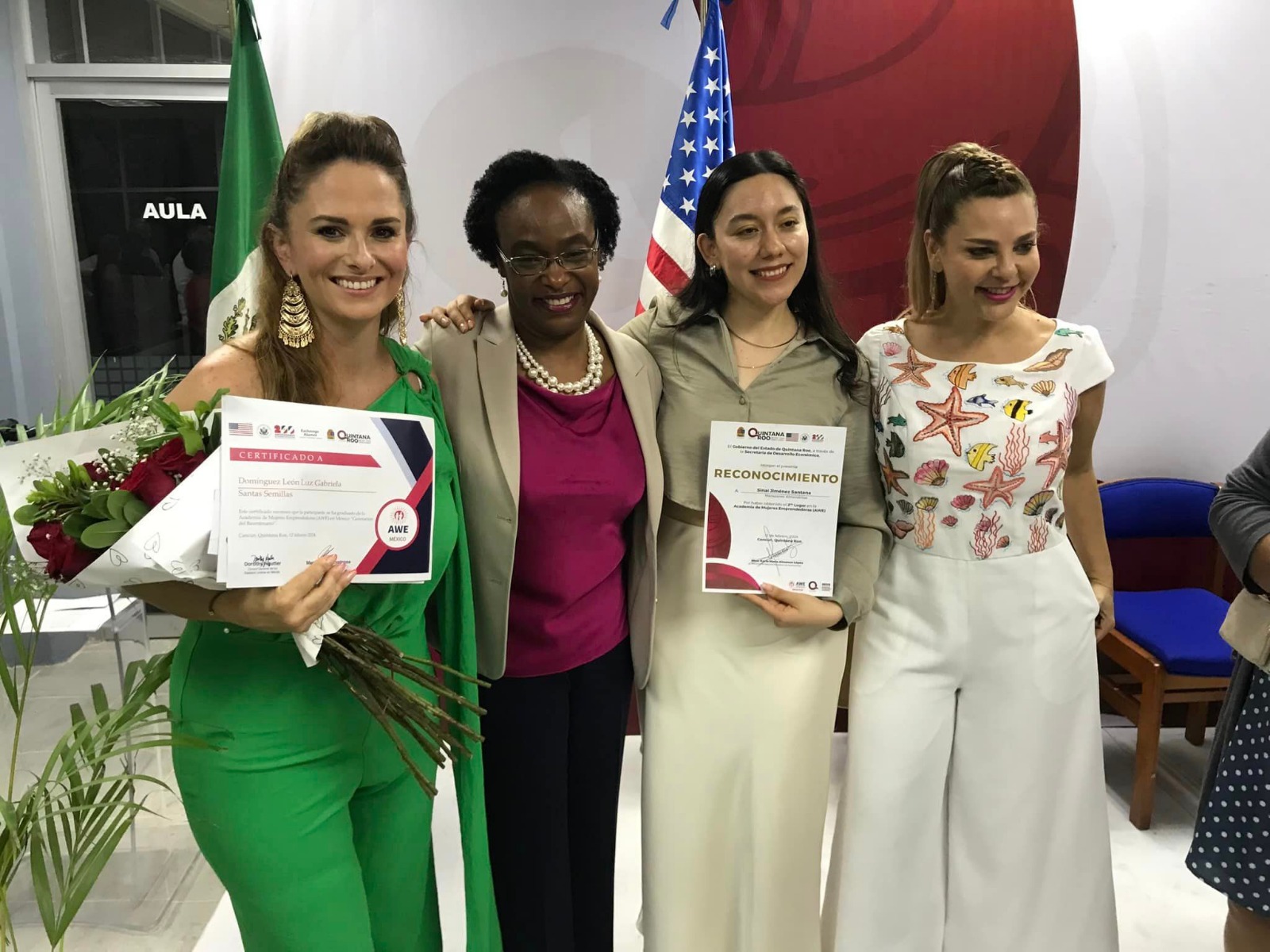 Durante la entrega de certificados que se llevó a cabo en el Instituto Tecnológico de Cancún, asistió la Honorable Dorothy Ngutter, Cónsul General de Estados Unidos en Mérida; del programa AWE, María Cristina Acevedo Hernández; AWE Nacional, Jorge Luis Torres Aguilar; la presidenta municipal de Benito Juárez, Ana Paty Peralta de la Peña y el Jefe de Oficina de la Gobernadora, Artemio Santos Santos.